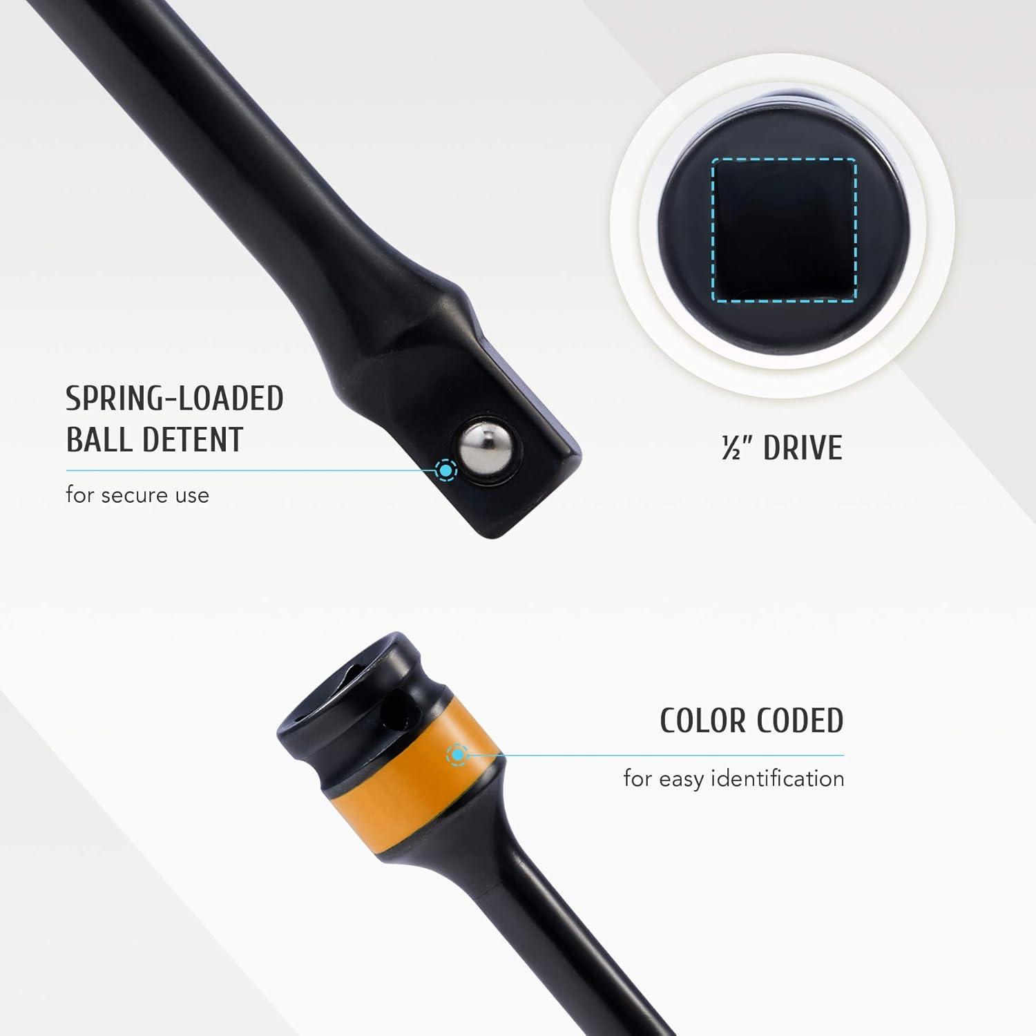 BALL-DETENT DESIGN: The spring-loaded detent ball design on these torque extension bars provides highly accurate, fast, reliable, and repeatable response to any torque overload, disengaging the tool and preventing damage to your wheels and car