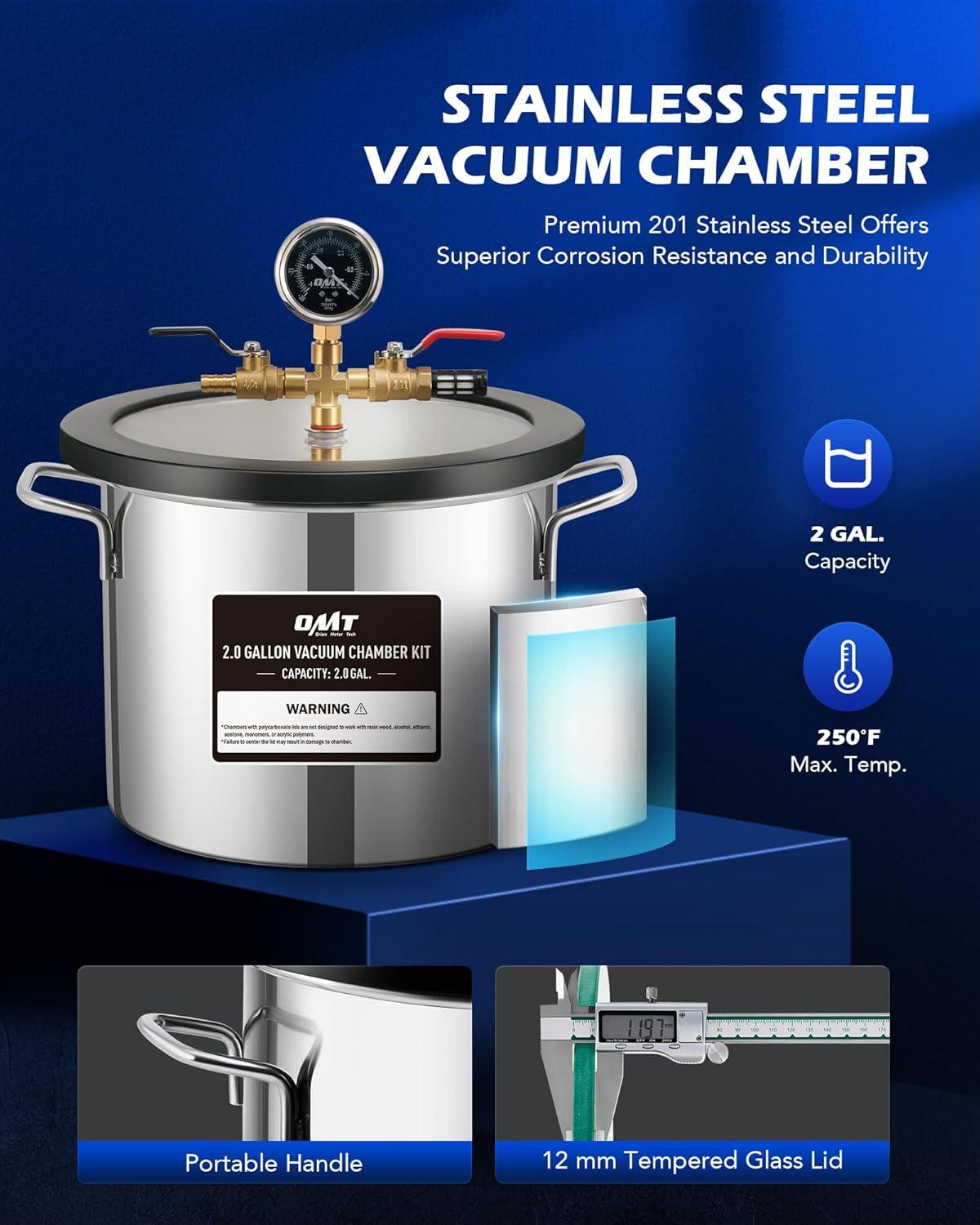 Orion Motor Tech 1.5 Gal Vacuum Chamber with Pump Kit, 3.5 cfm Vacuum Pump and Chamber Kit with Tempered Glass Lid 5 ft Hose, Vacuum Degassing Chamber Kit for Stabilizing Wood Degassing Silicone Resin(2.0 Gal.)
