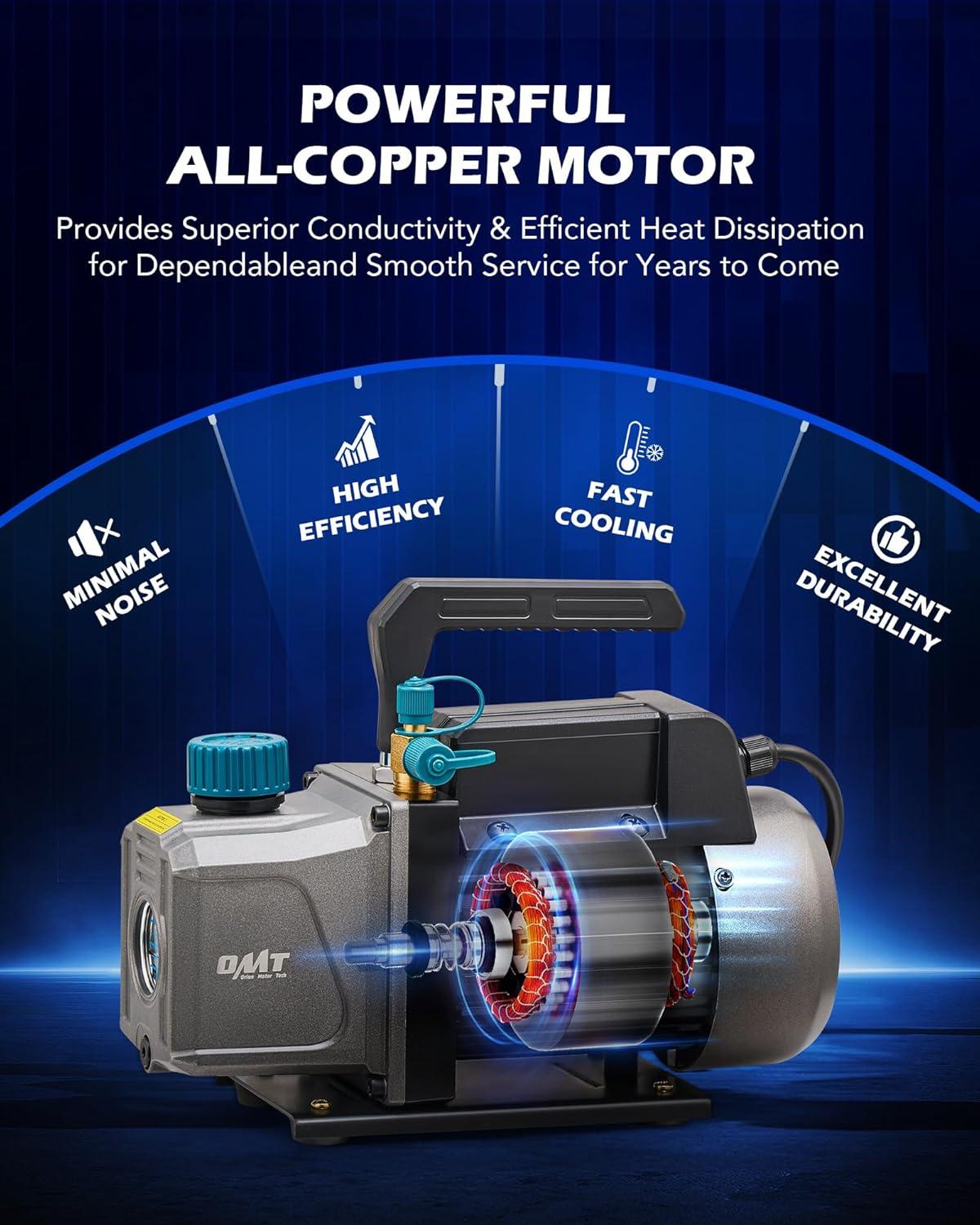 High Efficiency Vacuum Pump: Equipped with an all-copper motor, this vacuum pump ensures efficient evacuation at a 3.5 cfm flow rate. Its aluminum alloy casing dissipates heat and resists corrosion, and brass-fitted tethered safety caps prevent oil leaks