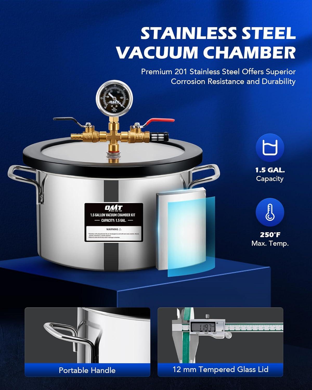 1.5 gal. Stainless Steel Chamber: Made from 201 stainless steel, our chamber withstands pressure, corrosion, and heat up to 250°F and features a tempered glass lid with a 1.5 mm silicone gasket for a tight seal and a liquid-filled gauge for easy monitoring