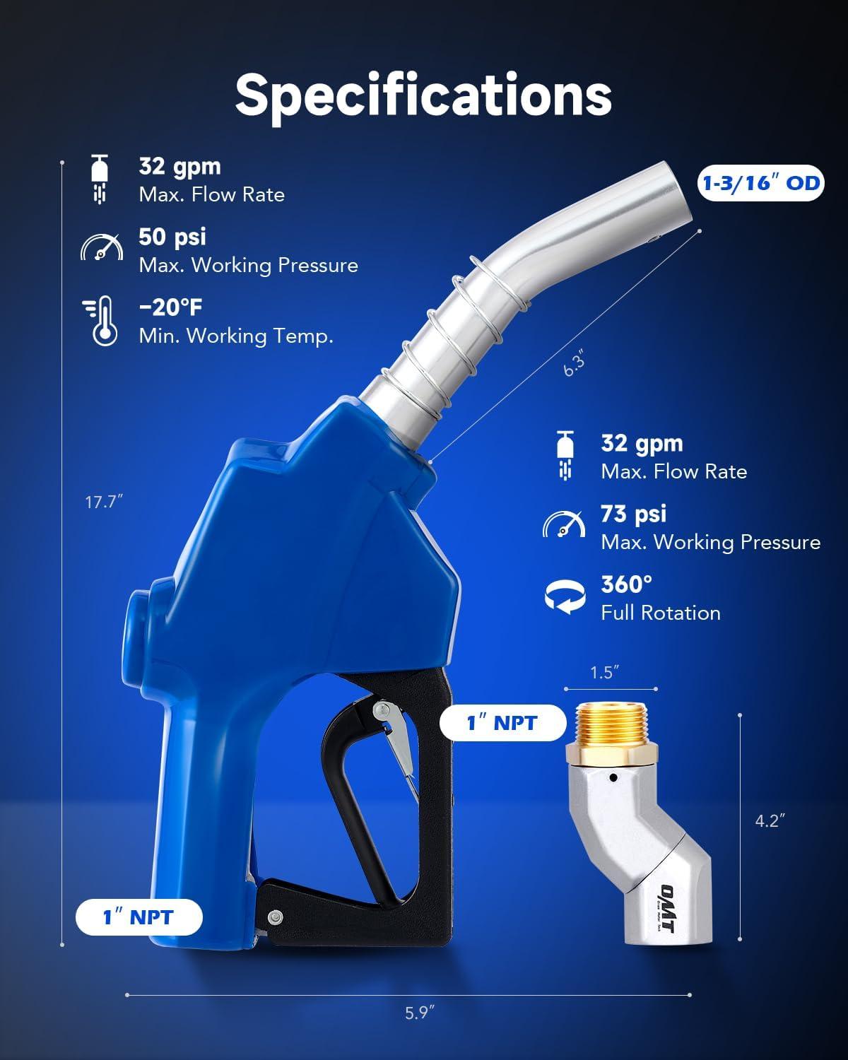 Orion Motor Tech 1" NPT Automatic Fuel Nozzle Kit, Auto Shut Off Fuel Nozzle with 360° Hose Swivel, Gas Fuel Transfer Refilling Nozzle with 1-3/16" Spout 32 gpm for Gasoline Diesel Kerosene(1" by 1-3/16")
