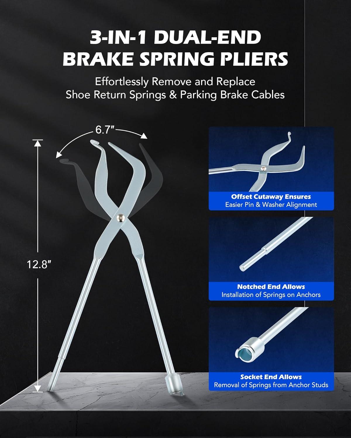 Multifunctional Pliers: With a wide 6.7″ jaw opening, the dual-end brake spring pliers handles both shoe return springs and parking brake cables with ease. The notched end installs springs onto anchors, while the socket end allows for efficient removal