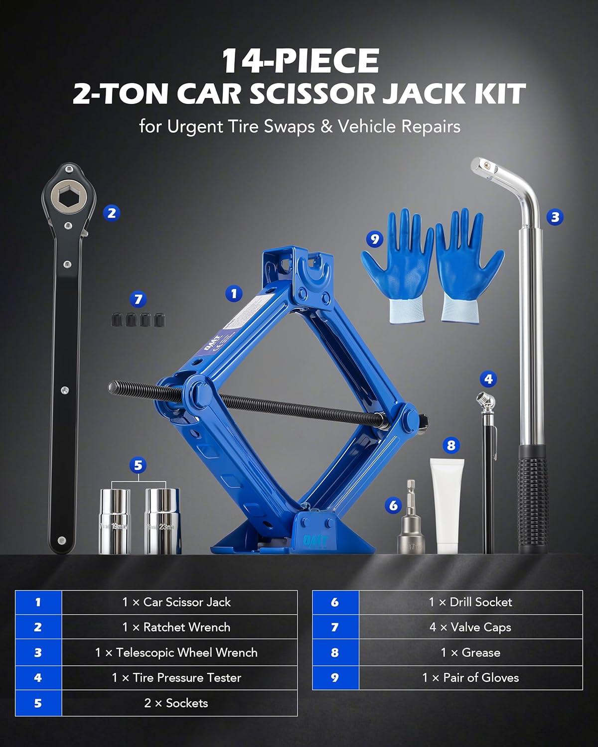 Orion Motor Tech 2 Ton Scissor Jack, 14 pc. Car Scissor Jack Kit for Sedan SUV MPV with Drill Socket Ratchet Wrench, 4409 lb. Portable Car Jack and Stand Kit for Tire Changing