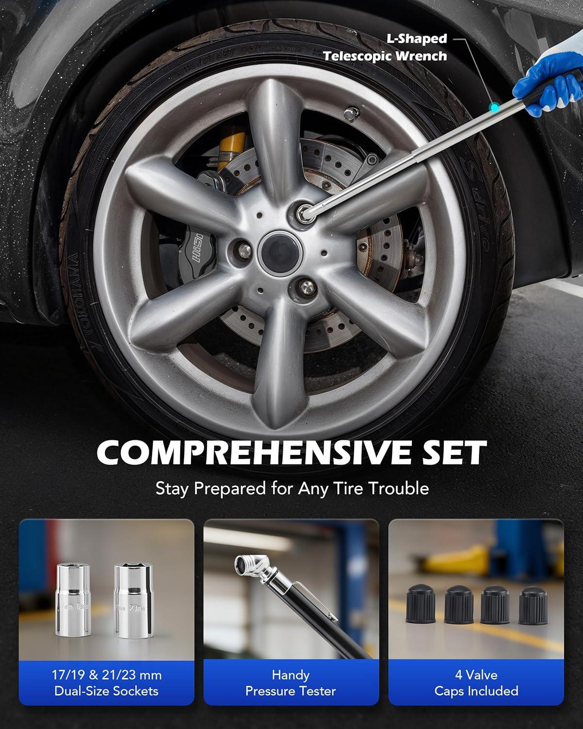 Compact Size: At just 17.5×5.2×4.6 in., this portable car jack kit fits neatly in your trunk or garage. It's easy to store and always ready for quick tire changes without taking up much space