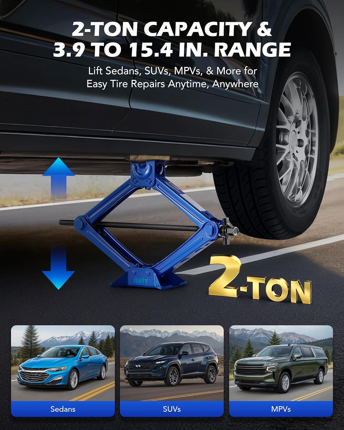 Effortless Tire Changes: Orion Motor Tech's 14 pc. car scissor jack kit supports up to 2 tons (4409 lb.) with a height range of 3.9 to 15.4 in. Ideal for quick & easy tire changes on sedans, SUVs, MPVs, and more
