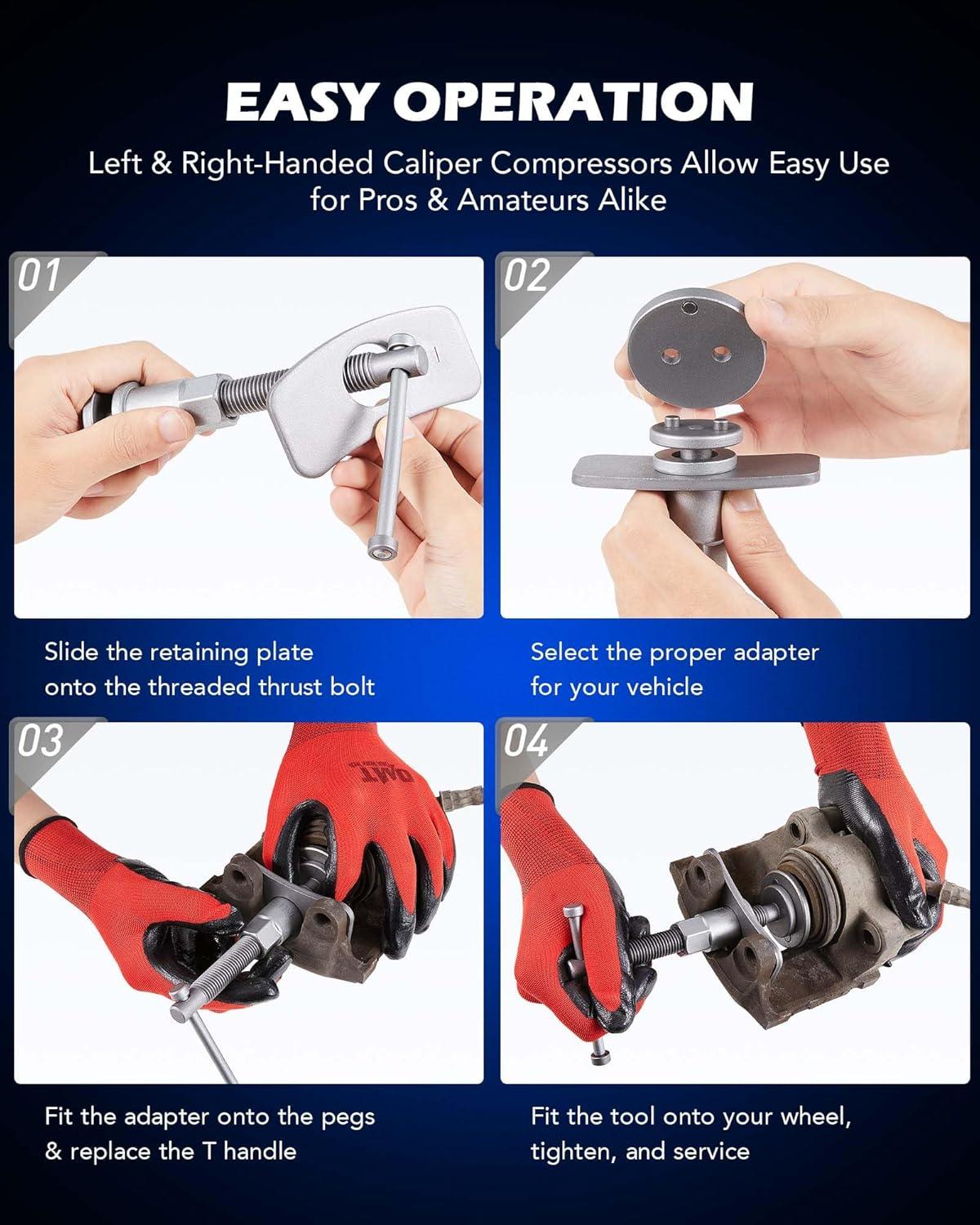 COMPLETE BRAKE CALIPER TOOL SET: This Orion Motor Tech 24-piece brake caliper tool set includes 2 retaining plates, left and right thrust bolt assemblies, 18 disc adapters, 2 brake hangers, a carry case, and a pair of gloves