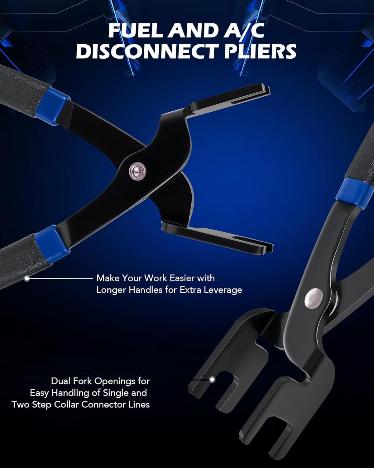 Fuel and AC Disconnect Pliers: Effortlessly disconnect and reconnect AC and fuel lines, even in hard-to-reach areas. The extended handle provides extra leverage, while the dual fork openings make handling both single and two-step collar connector lines a breeze.