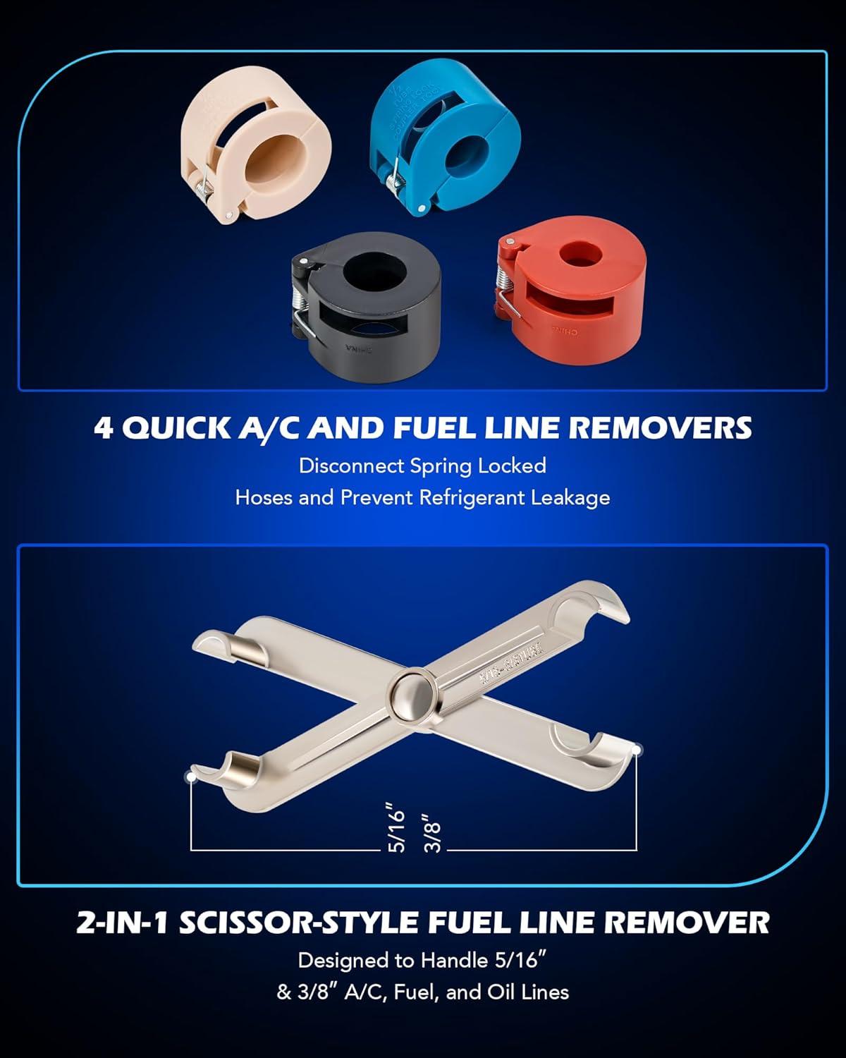 Disconnect Fuel Line with Ease: Orion Motor Tech's master quick disconnect tool set offers a comprehensive solution for easily disconnecting automotive AC hoses and fuel lines, compatible with various domestic vehicles, including Ford, Chevy, Dodge, and more.