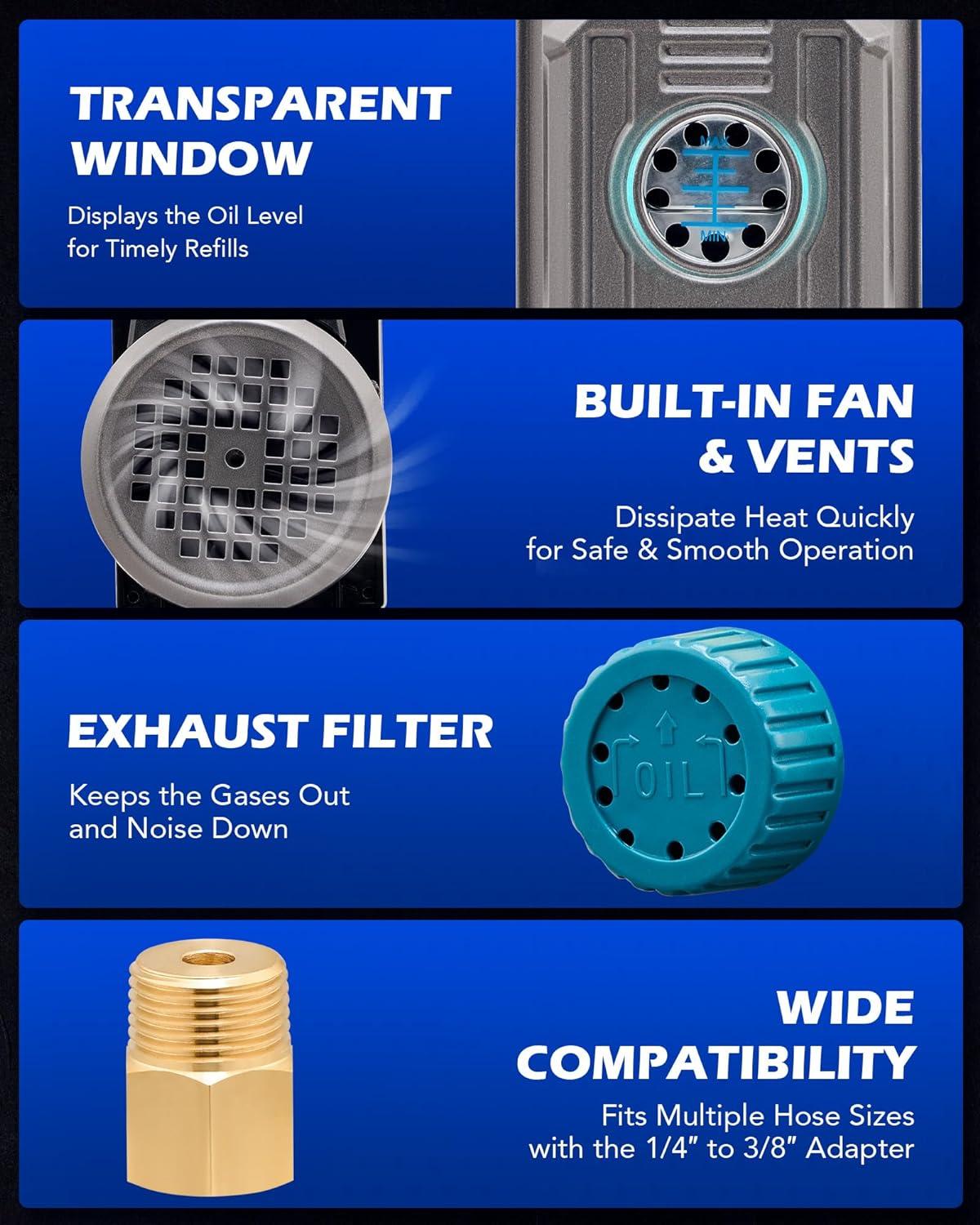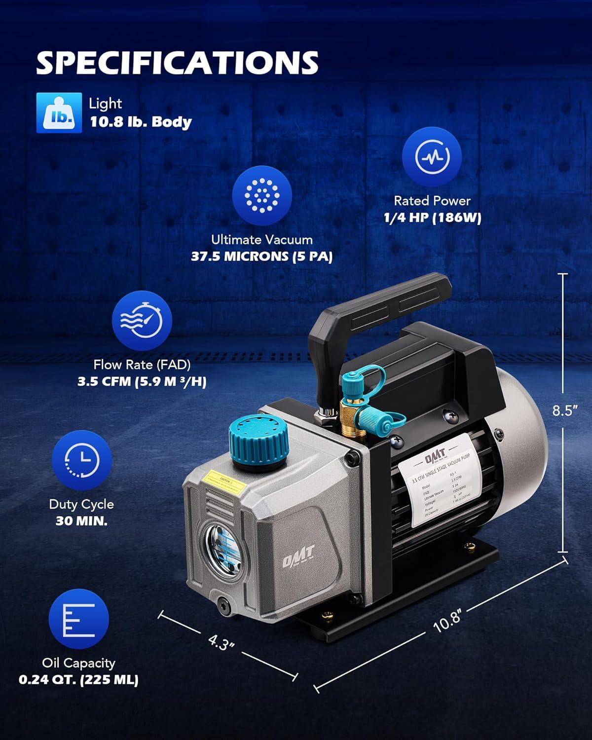 High Efficiency Vacuum Pump: Equipped with a robust all-copper motor, this vacuum pump ensures efficient evacuation at a 3.5 cfm flow rate. Its reinforced aluminum alloy casing efficiently dissipates heat and resists corrosion, and brass-fitted tethered safety caps prevent oil leaks during transport.