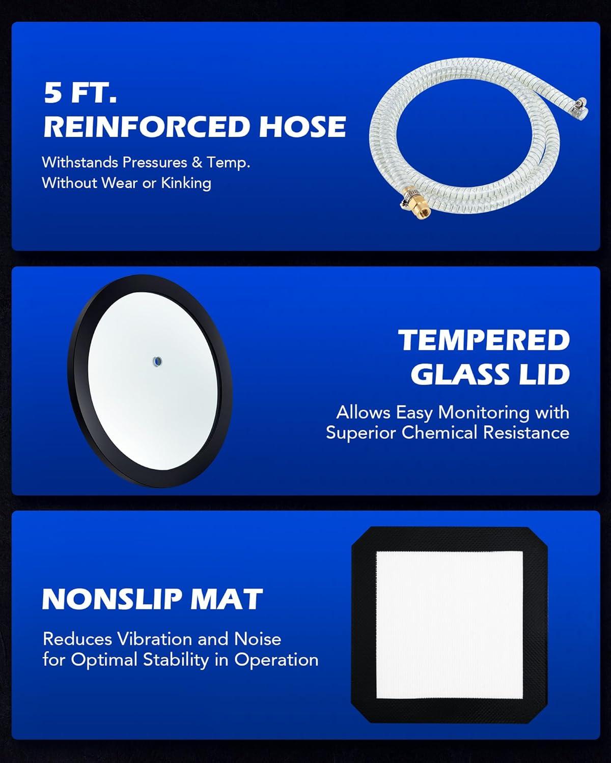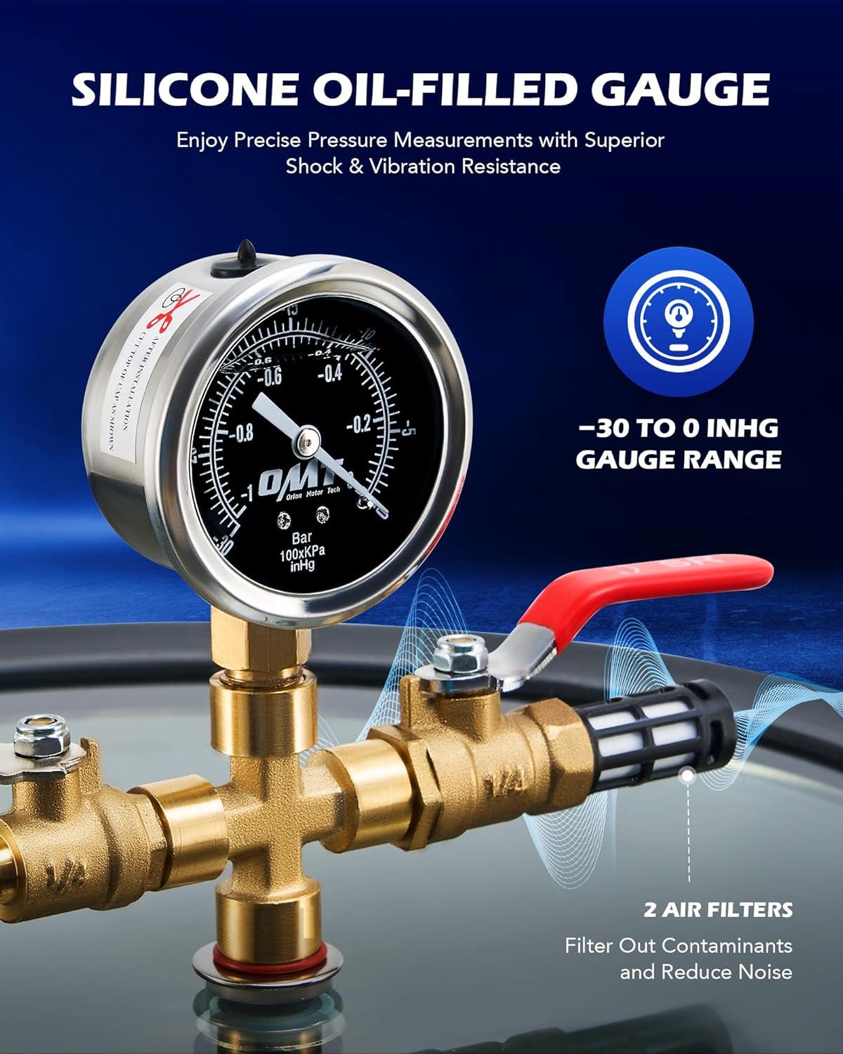 5 Gallon Stainless Steel Chamber: Made of brushed 201 stainless steel, this vacuum chamber withstands pressure, corrosion, and heat up to 250°F. The transparent tempered glass lid and liquid-filled gauge allow easy monitoring of the degassing process, while two air filter and a nonslip pad help minimize noise.