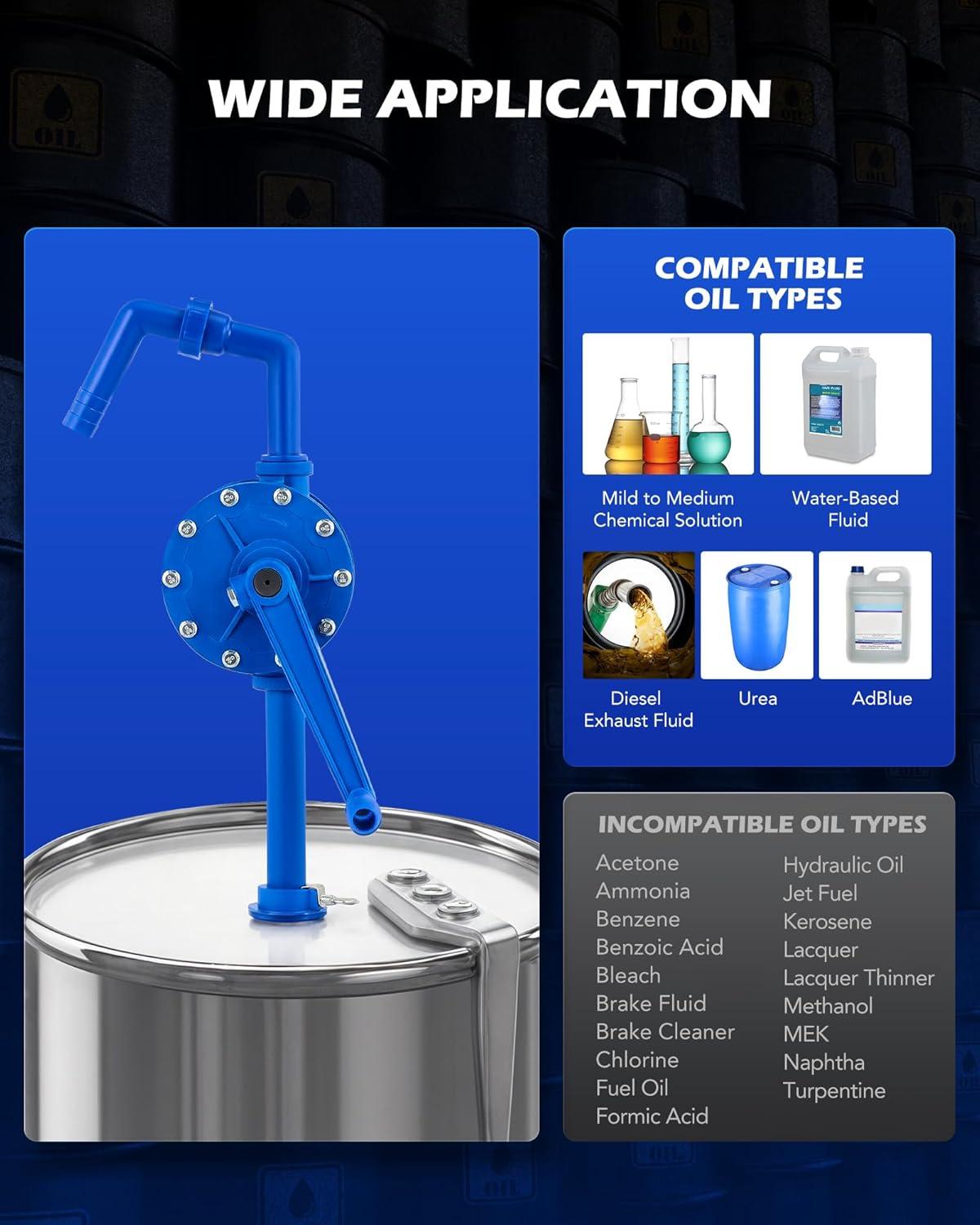 Wide Compatibility: The 0.89″ spout of our 55 gal barrel pump enables easy dispensing of a variety of chemical solutions and water-based fluids, including urea, AdBlue, fuel oil, and more! However, it is not suitable for gasoline or high-viscosity fluids