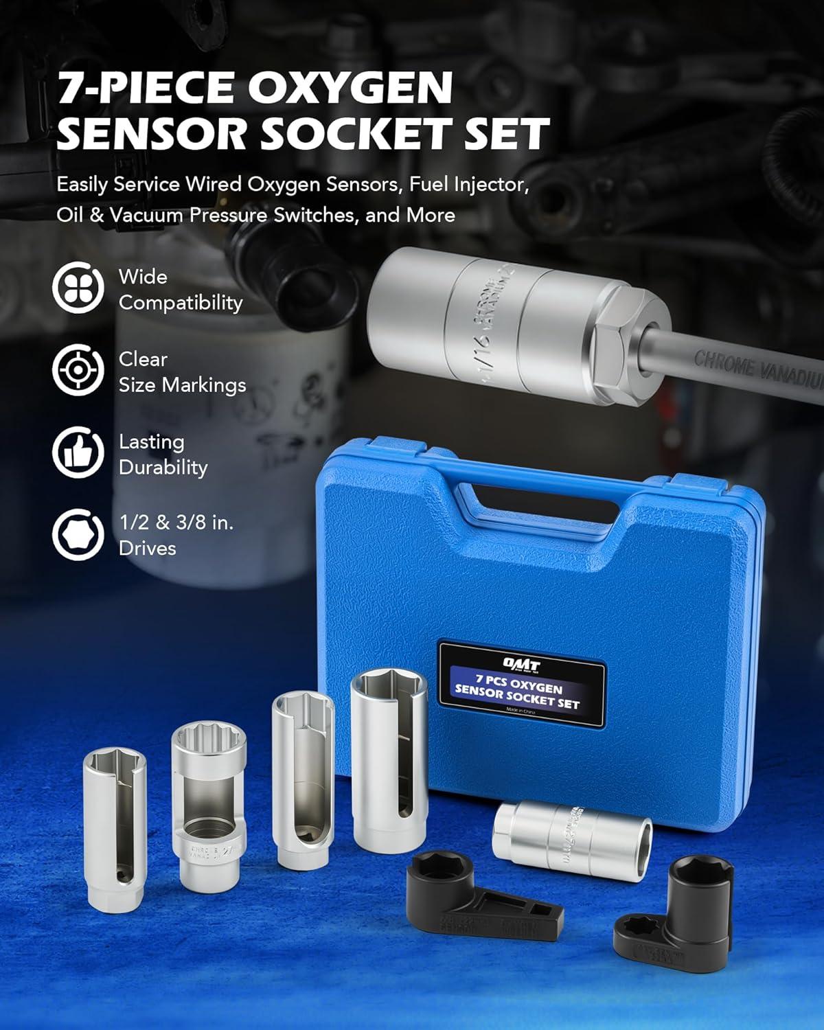 Comprehensive Kit: Orion Motor Tech's 7pc. oxygen sensor socket set includes 5 sockets in 22 mm, 27 mm, & 29 mm sizes with 3/8 and 1/2 in. drive, plus 2 sensor wrenches, providing everything you need for precise oxygen sensor servicing