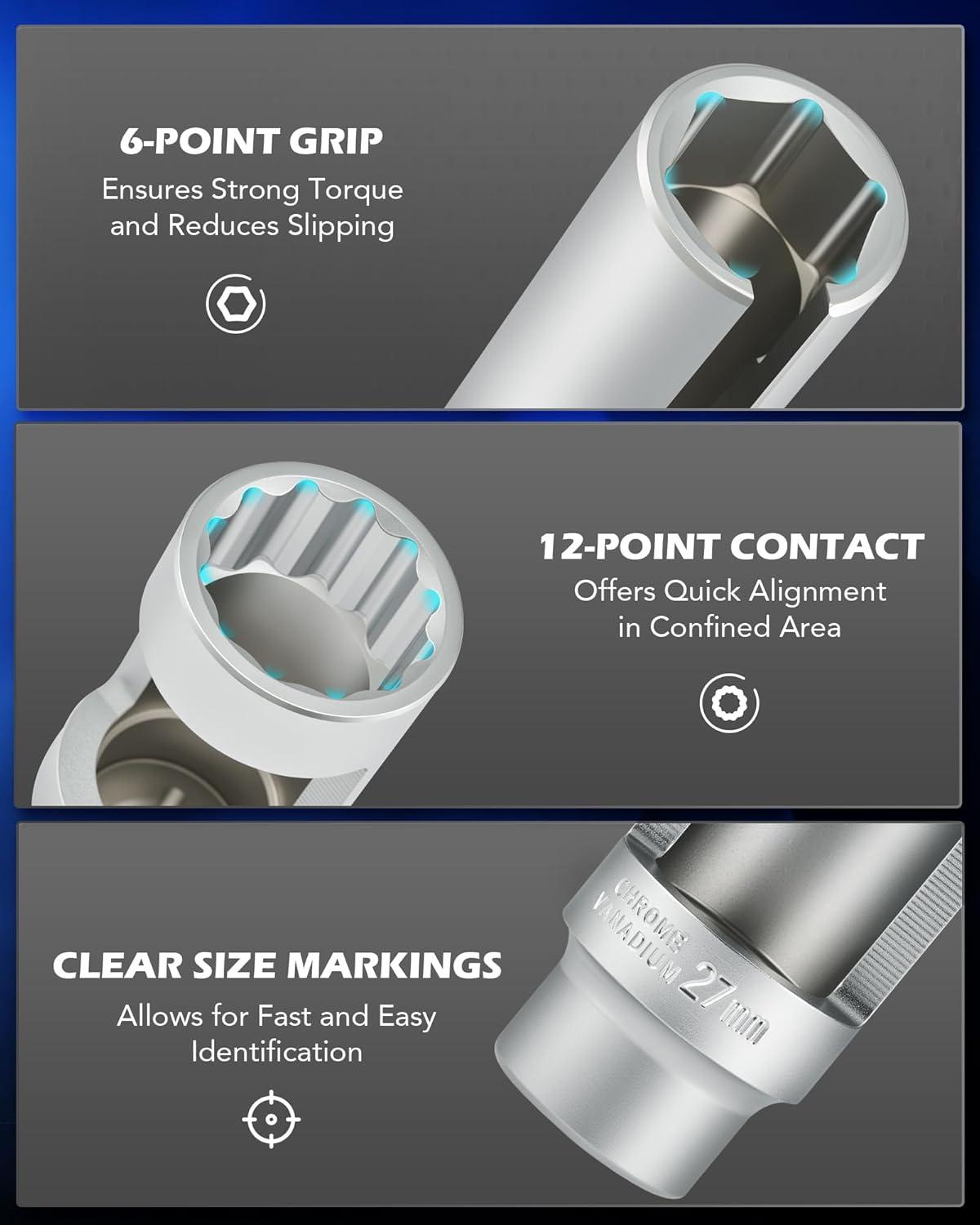 Access Tight Spots: The U-shaped groove keeps wiring intact while allowing fast and safe removal without cutting wires. Our 12-point socket makes it easy to align and access sensors in cramped spaces, while the 6-point sockets provide maximum torque