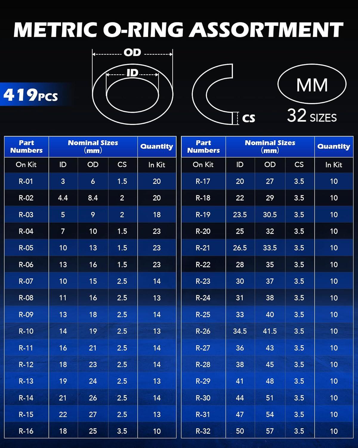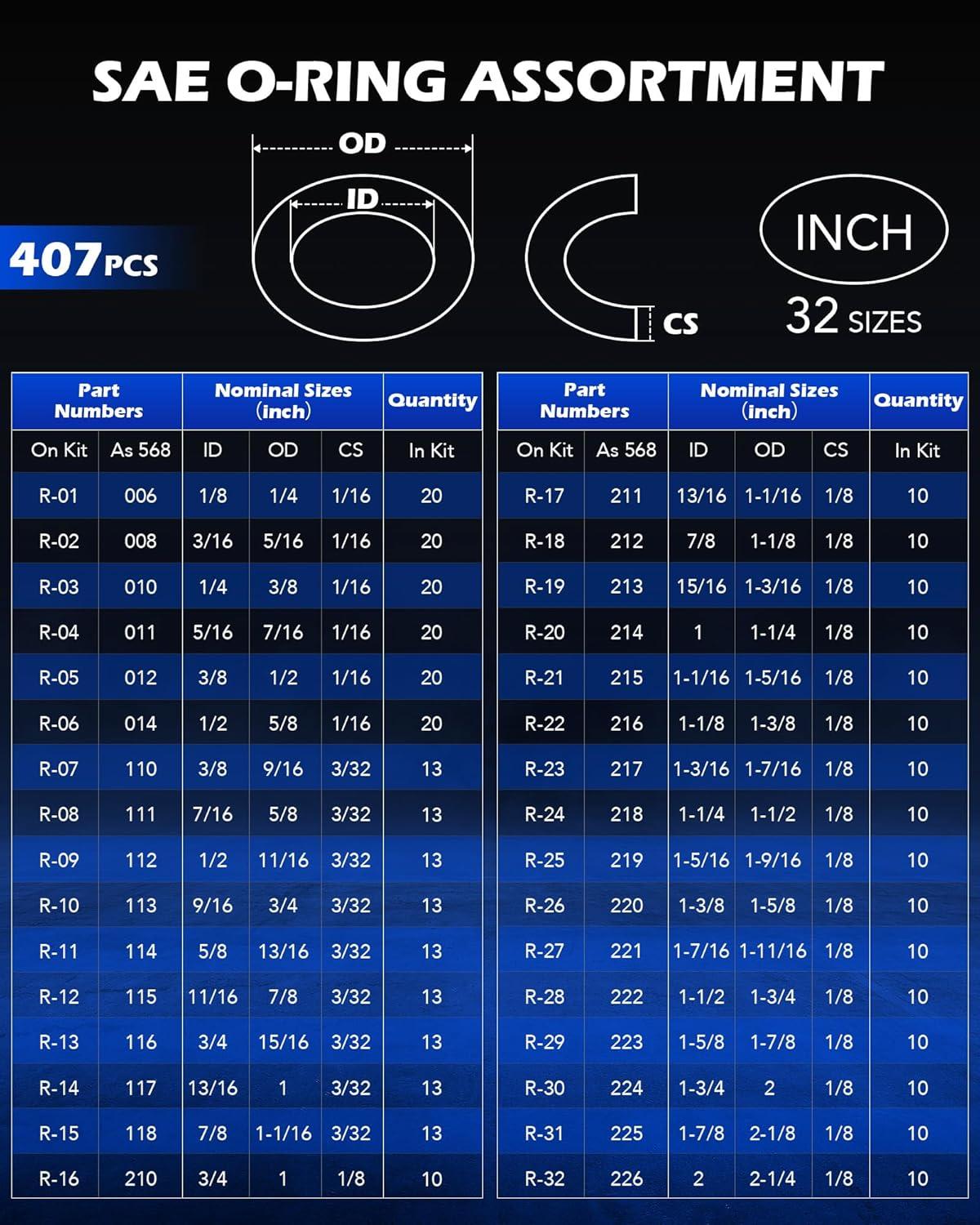 826pc O-Ring Set: Orion Motor Tech's O-ring set includes 407 SAE O-rings and 419 metric O-rings in the 32 essential sizes; SAE O-rings range from -006 to -226 and metric O-rings cover inner diameters from 3 to 50mm and outer diameters from 6 to 57mm