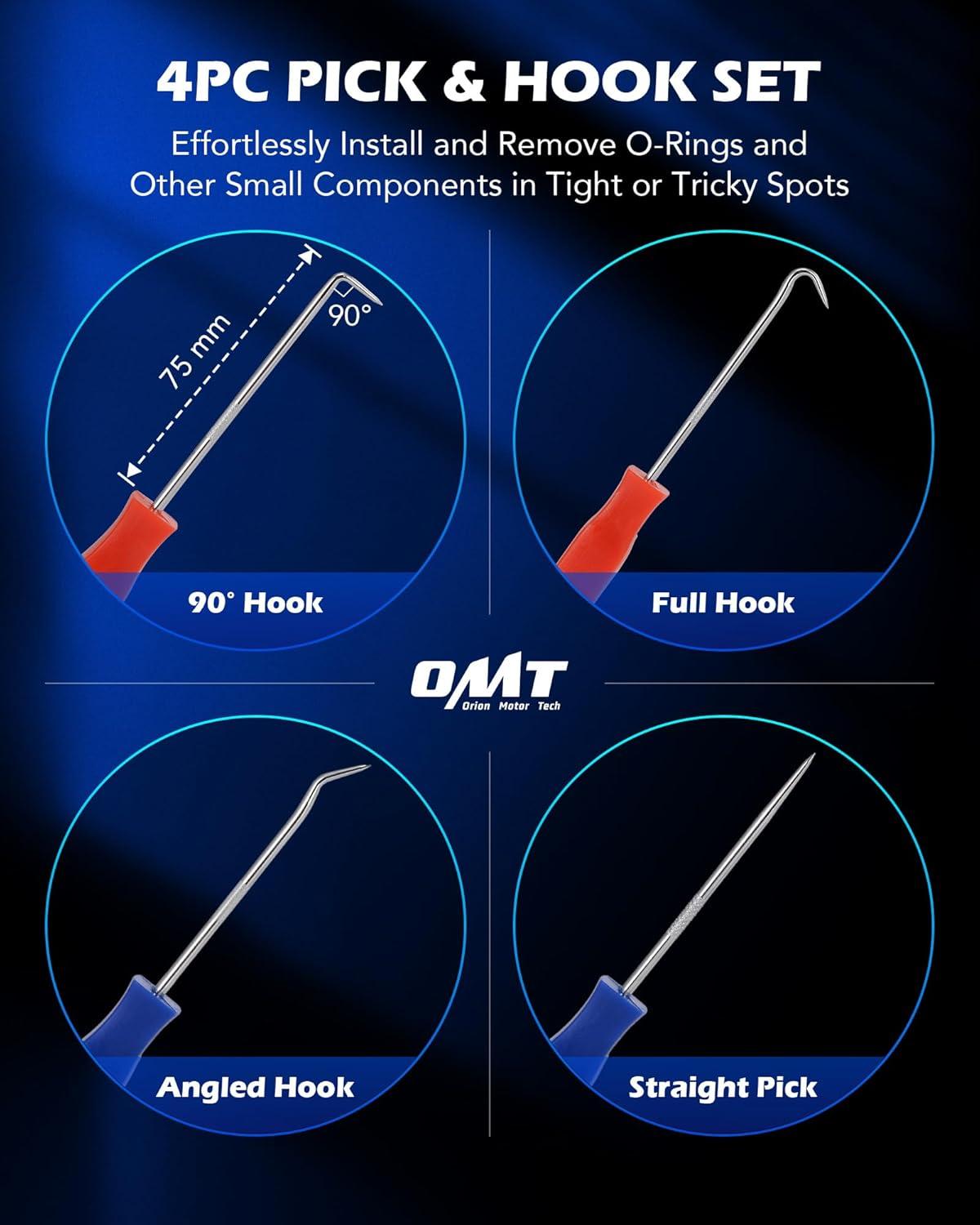 4 PC. Pick & Hook Set: Our SAE & metric rubber O-ring assortment kit features a straight pick, a full hook, a 90-degree hook, and an angled hook, making your repair projects easier and more efficient than ever