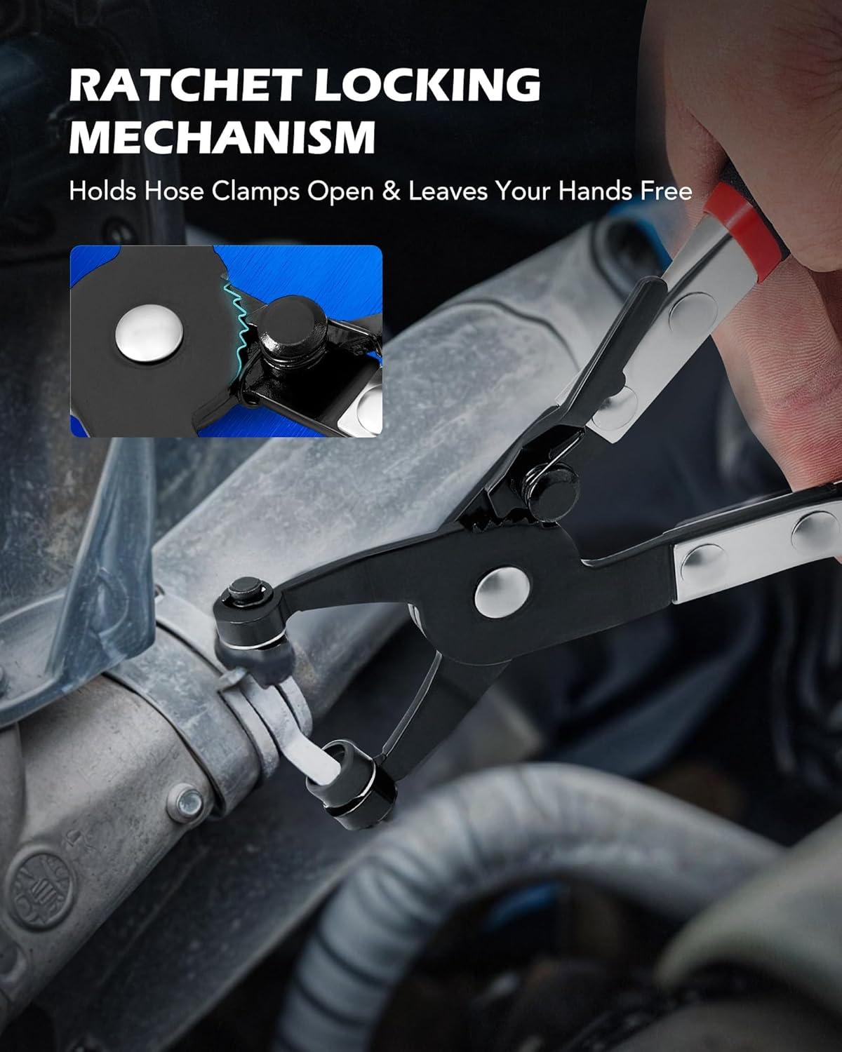 PERFECT FIT: Each pair of our well-engineered hose pliers works with hose clamps from 11/16 inch to 2-1/2 inches: the flexible hose clamp pliers, the swivel jaw band clip and cross slotted jaw pliers, and regular and angled flat band hose clamp pliers for spring-type clamps; the Clic-R collar pliers for ear-type clamps; and the hose removal pliers for most standard hoses