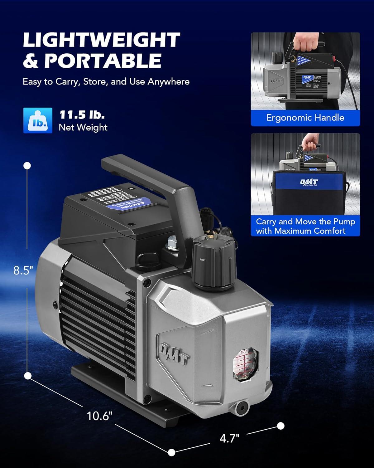 Compact, Versatile Pump: Compatible with 1/4″ SAE and 1/2″ ACME fittings, this versatile vacuum pump is ideal for HVAC, automotive, lab use, packaging, and beyond. Its compact design and ergonomic handle ensure easy portability and storage