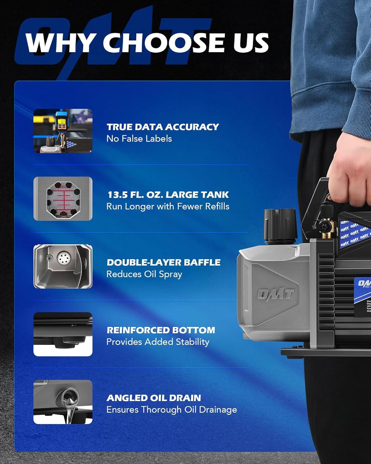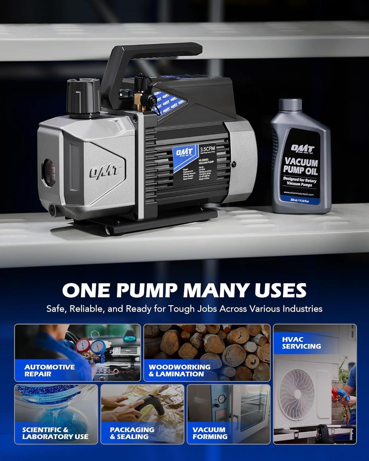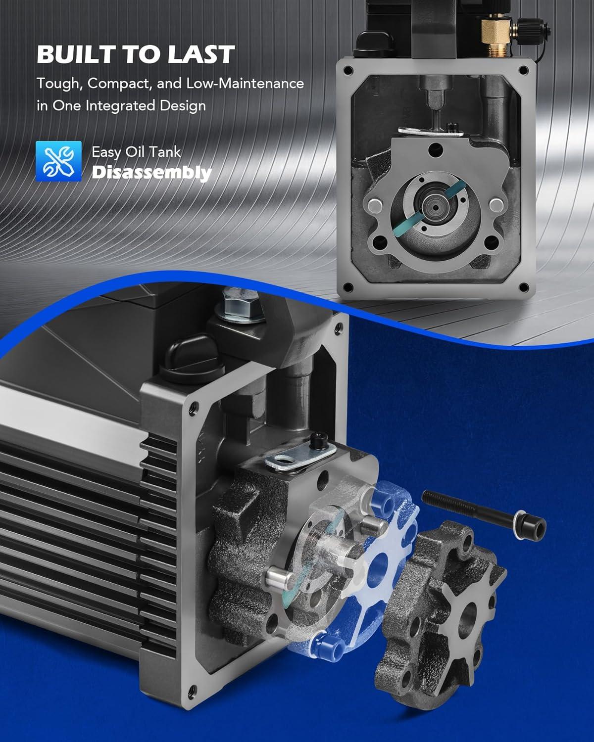 Minimized Oil Mist and Noise: With its oil mist-free cap on the combined oil fill/exhaust port, our a/c vacuum pump reduces oil mist for a cleaner and safer work environment. It also runs at or below 70 dB, ensuring a quieter & more comfortable workspace