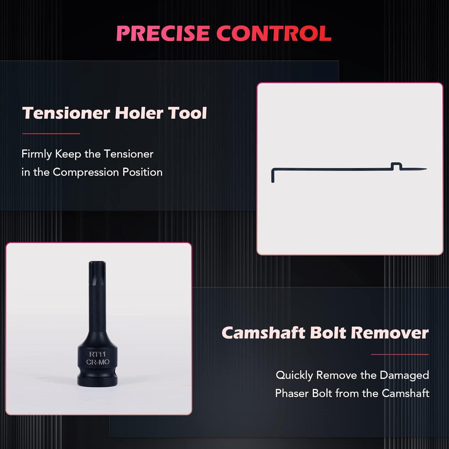 PRECISE CONTROL: The 303-1248 camshaft holding tools and 303-1530 chain tensioner holder firmly fix the parts in place, and the phaser bolt removal socket quickly removes the damaged phaser bolt from the engine cam, facilitating your timing chain and belt replacement, phaser bolt change, water pump maintenance, and more