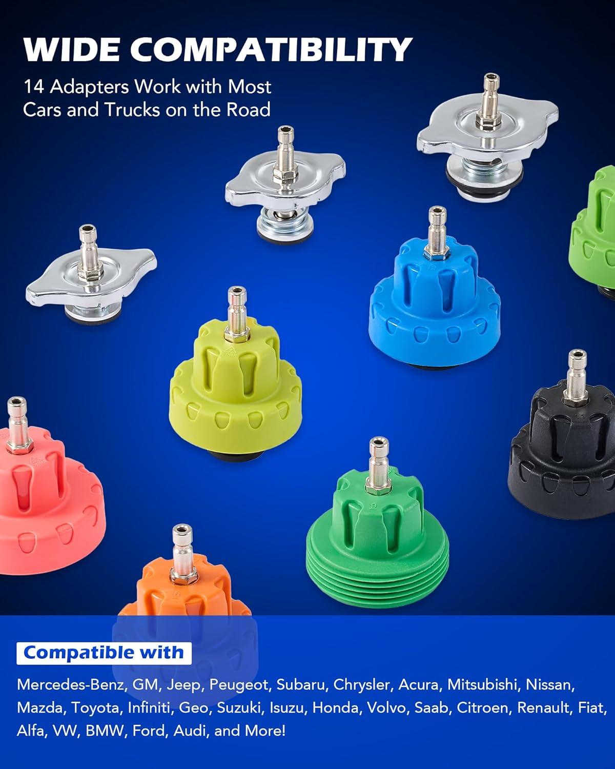 18 Adapters for Most Cars: With 18 radiator adapters, this coolant pressure tester kit is compatible with BMW, Ford, Fiat, VW, Porsche, Cadillac, Mercedes-Benz, Nissan, GM, Chevrolet, Peugeot, Chrysler, and more, giving you the right fit for any vehicle