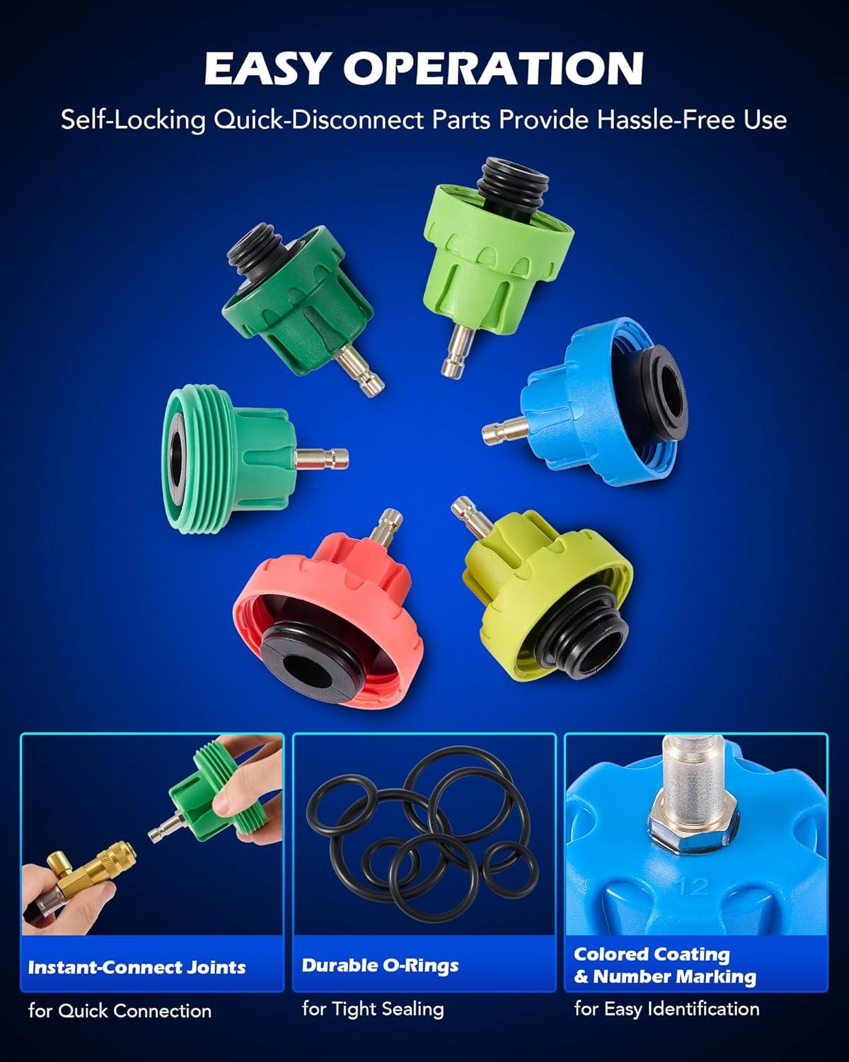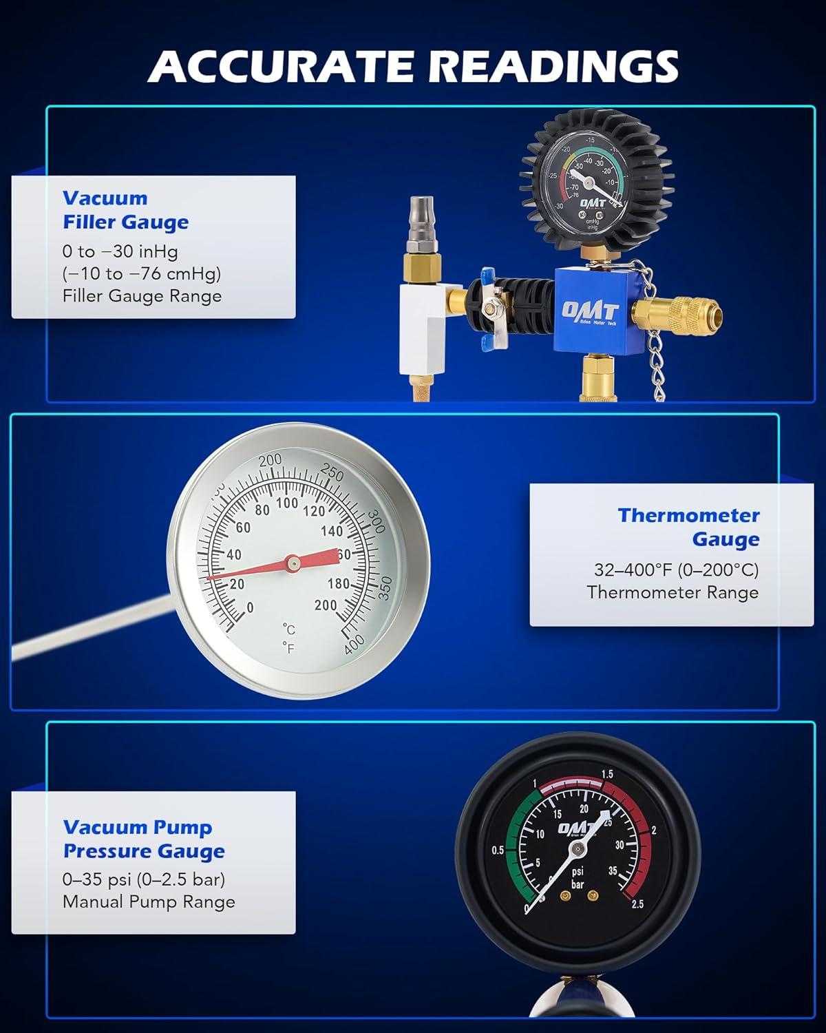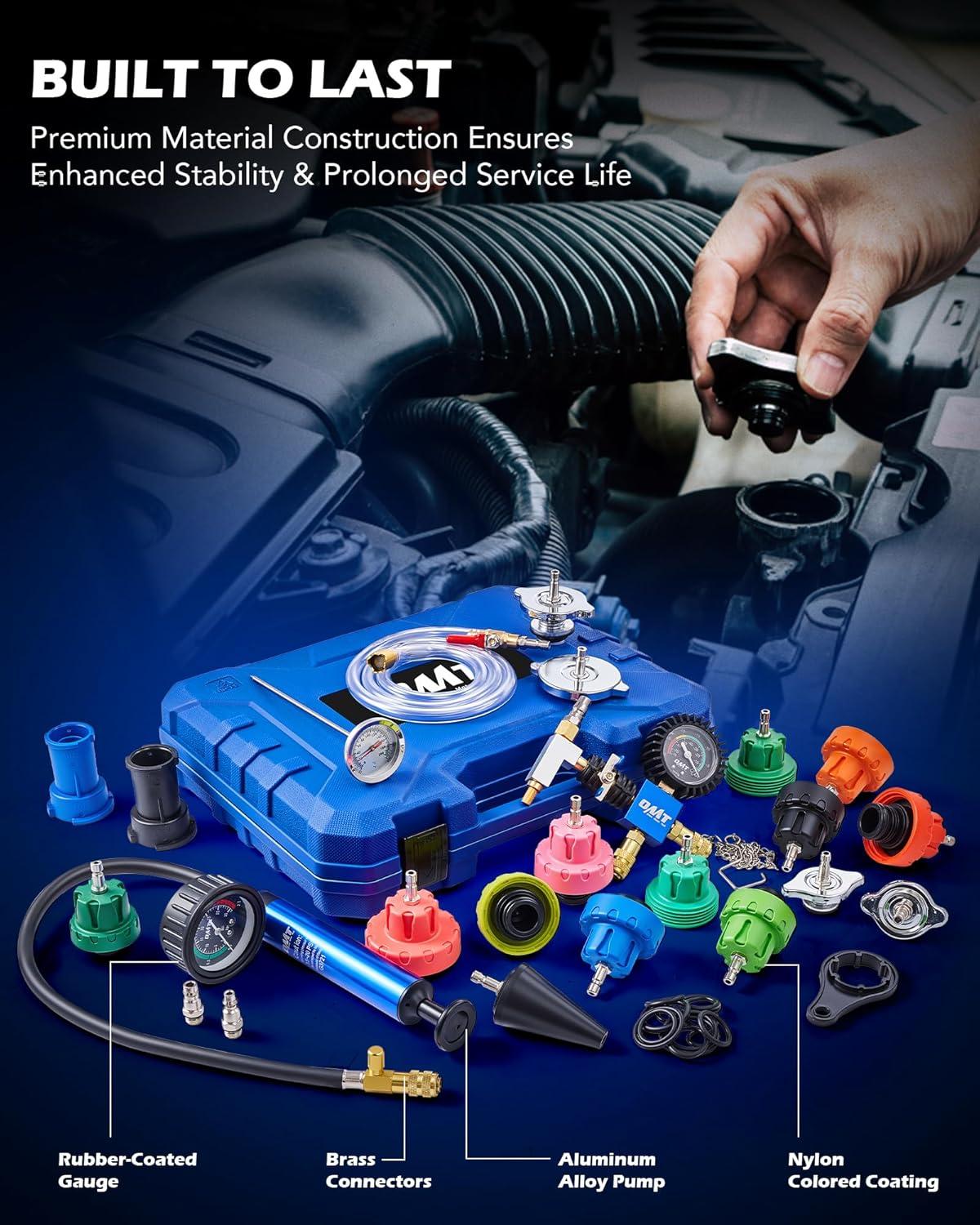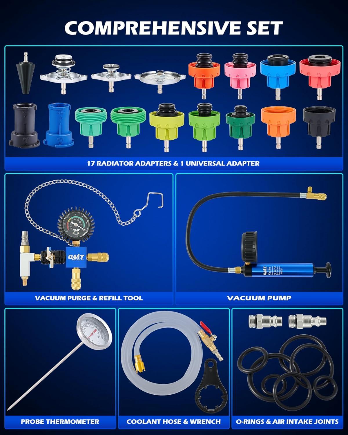 Comprehensive Set: Easily handle pressure leak testing and coolant refilling with Orion Motor Tech's 26 pc. cooling system pressure tester kit, including 18 adapters, vacuum pump, refill tool, thermometer, hose, wrench, air intake joints, & O-rings