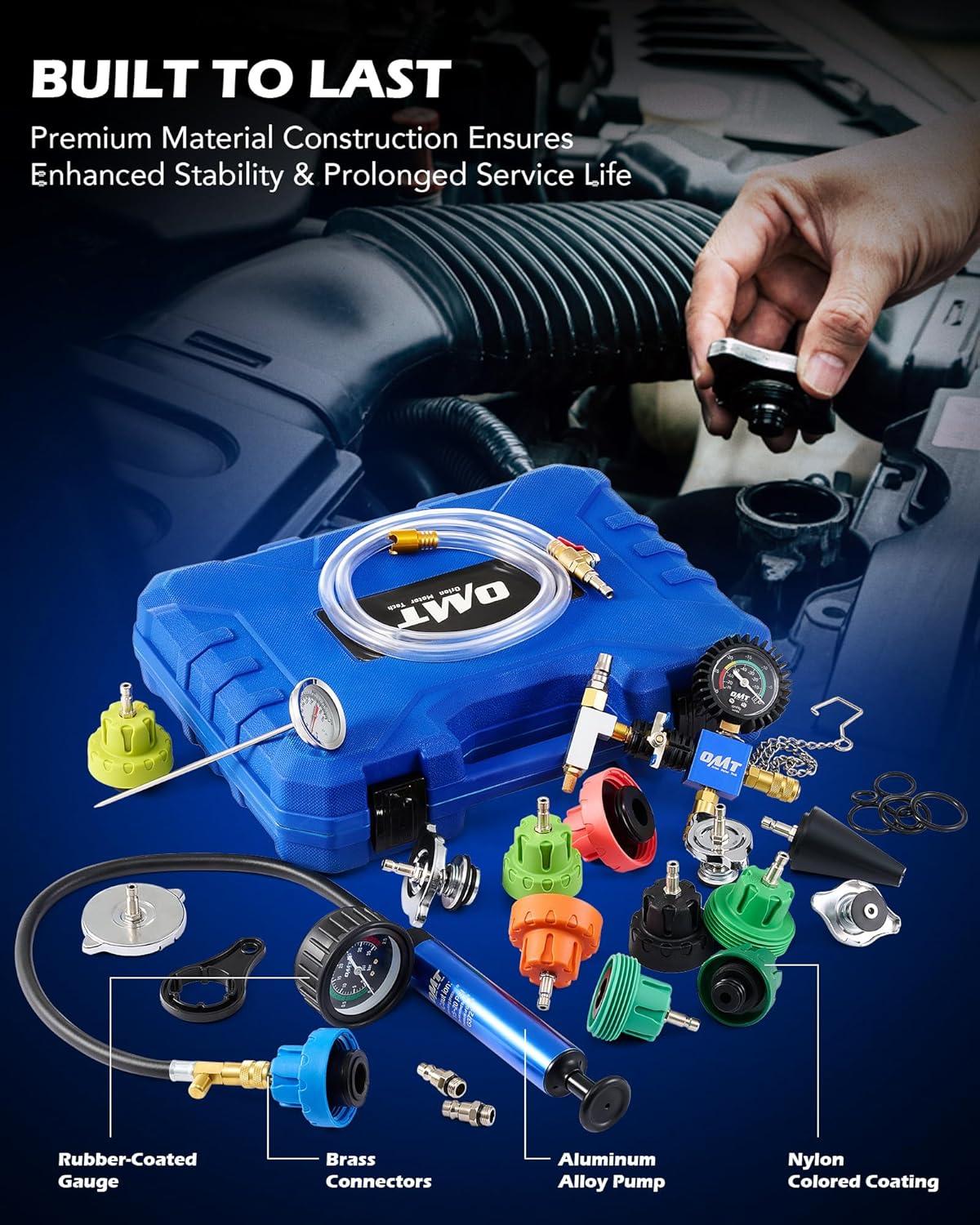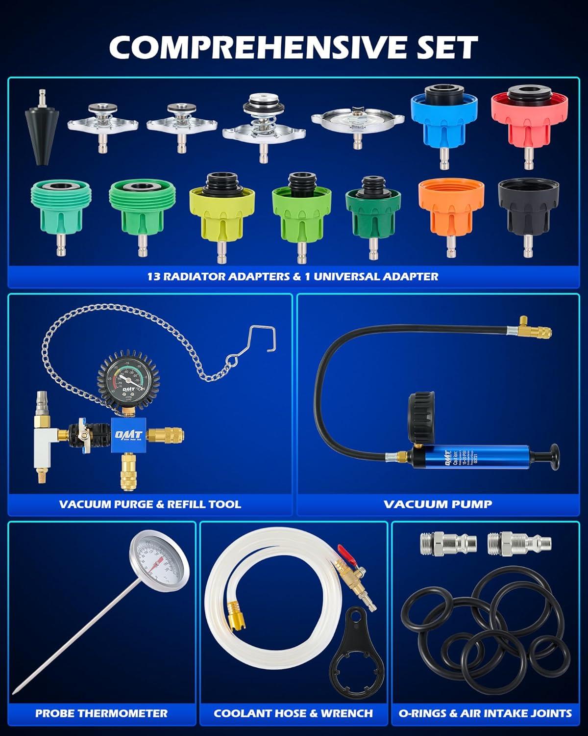 Comprehensive Tool Set: Orion Motor Tech's 22-piece cooling system pressure tester kit makes pressure leak testing and coolant refilling easier than ever! This all-in-one kit includes 13 adapters, a universal adapter, a vacuum pump, a vacuum purge & refill tool, a probe thermometer, a filling hose, a wrench, EU & US air intake joints, and O-rings.