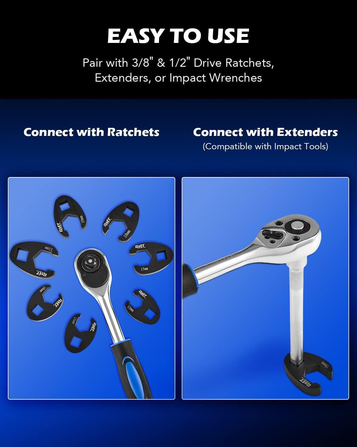 Works with Your Favorite Tools: Our crows foot wrenches work hand-in-hand with your trusted tools, including 3/8″ and 1/2″ drive ratchets, extenders, impact torque wrenches, and more