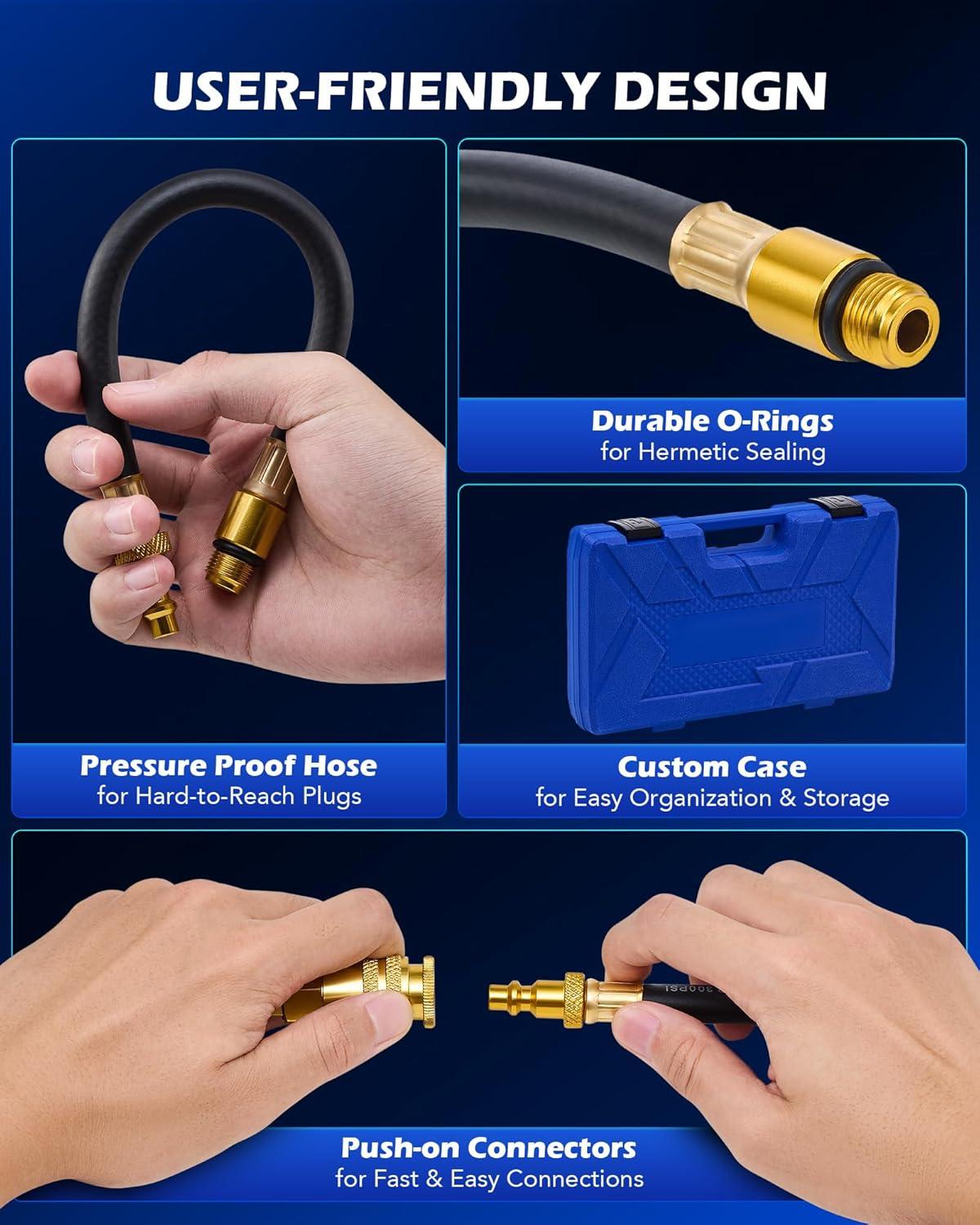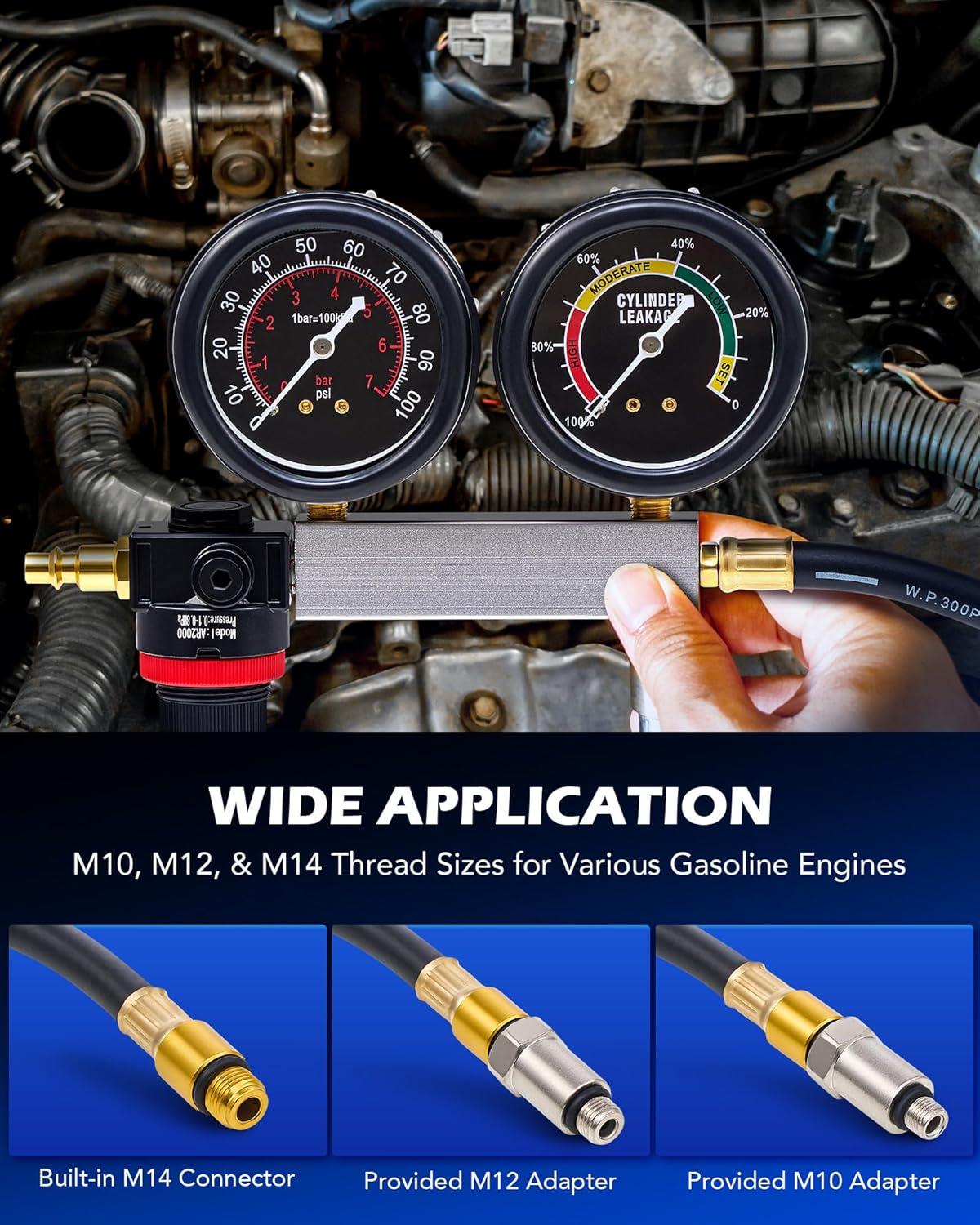 VERSATILE USE: This automotive leak down tester works with gasoline engines on a wide range of vehicles, from cars and trucks to ATVs, UTVs, motorcycles, and lawnmowers, thanks to the built-in M14 connector and the provided M10 & M12 adapters