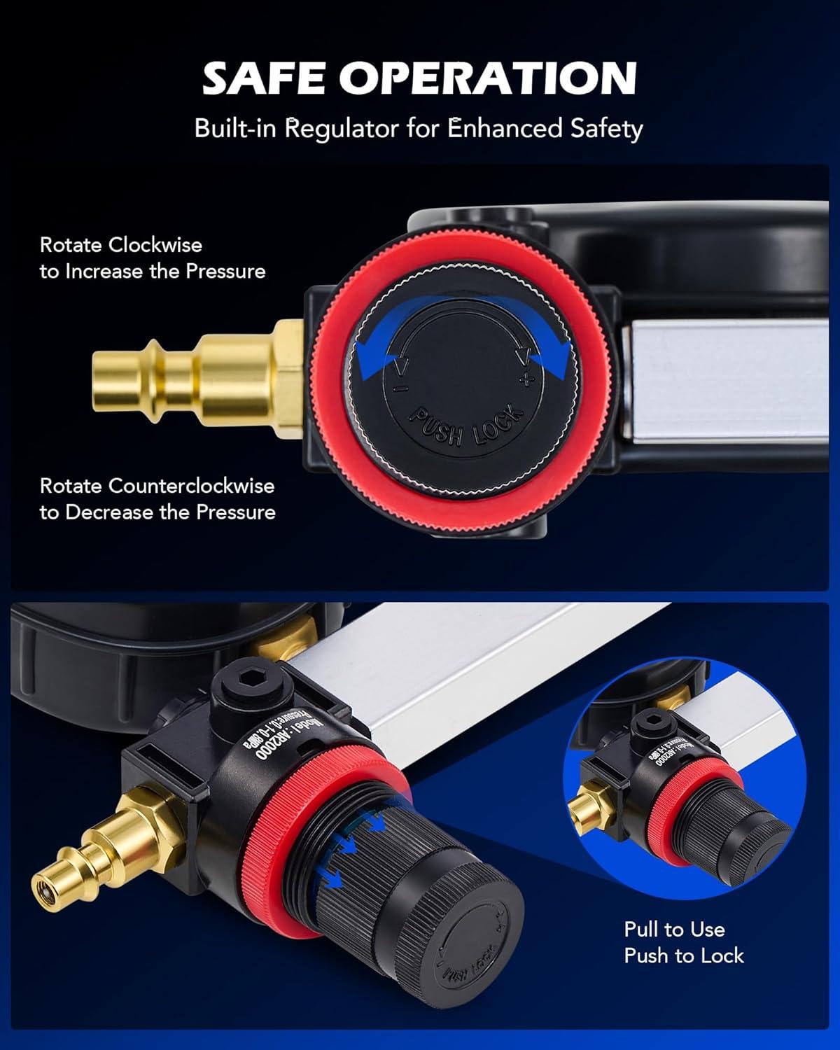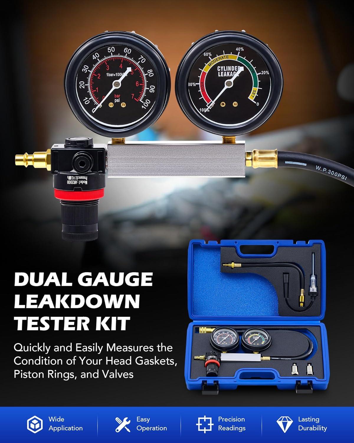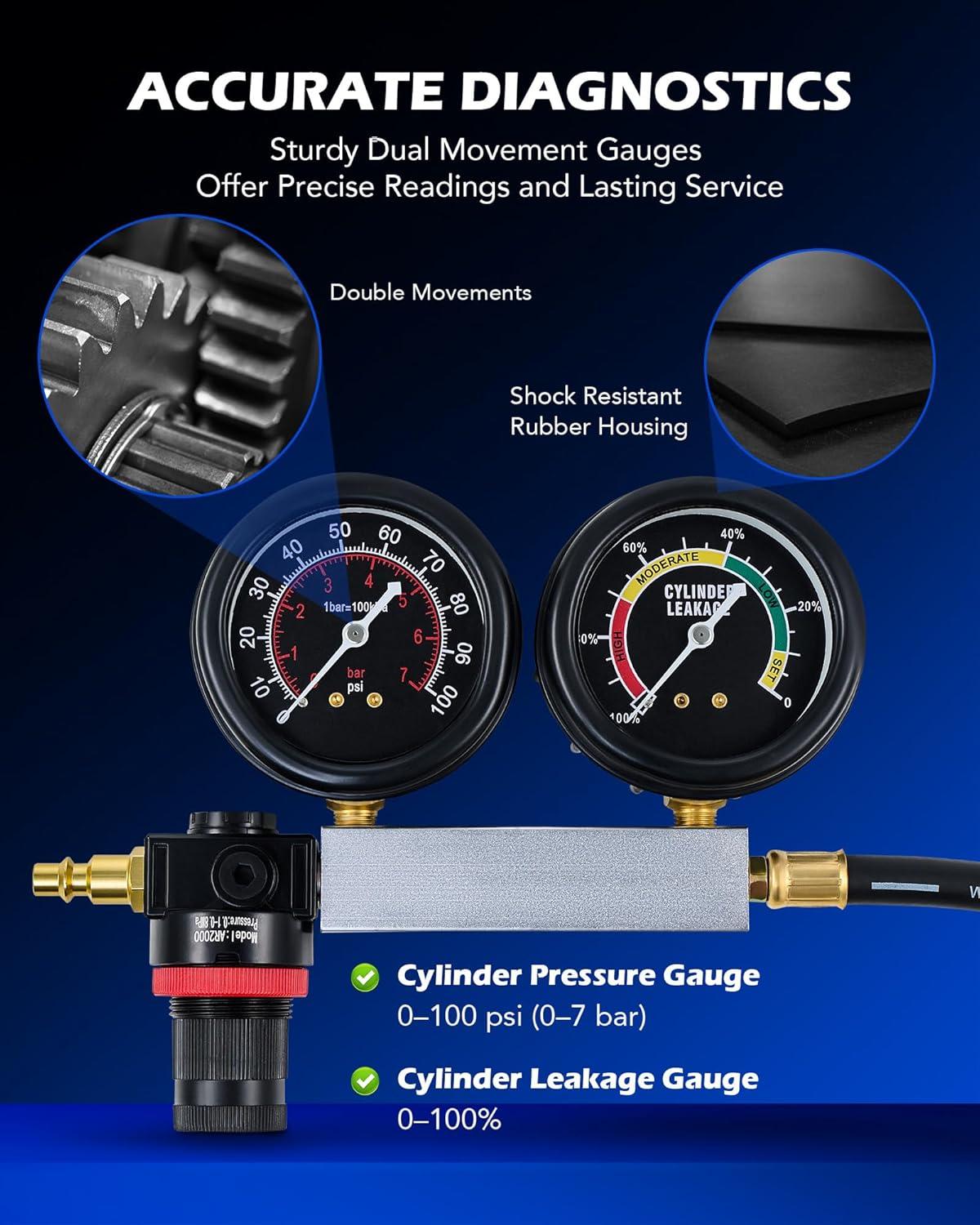 PRECISE READINGS: The dual gauges of our cylinder leakage tester tool feature shockproof rubber casings and extra large 2.7 inch dials, ensuring optimal precision and convenience