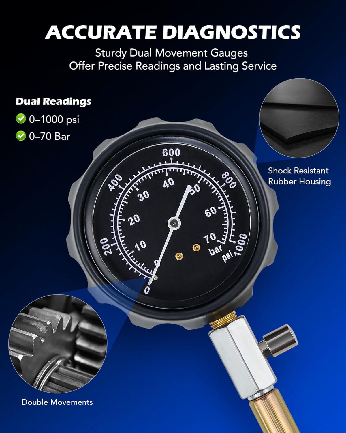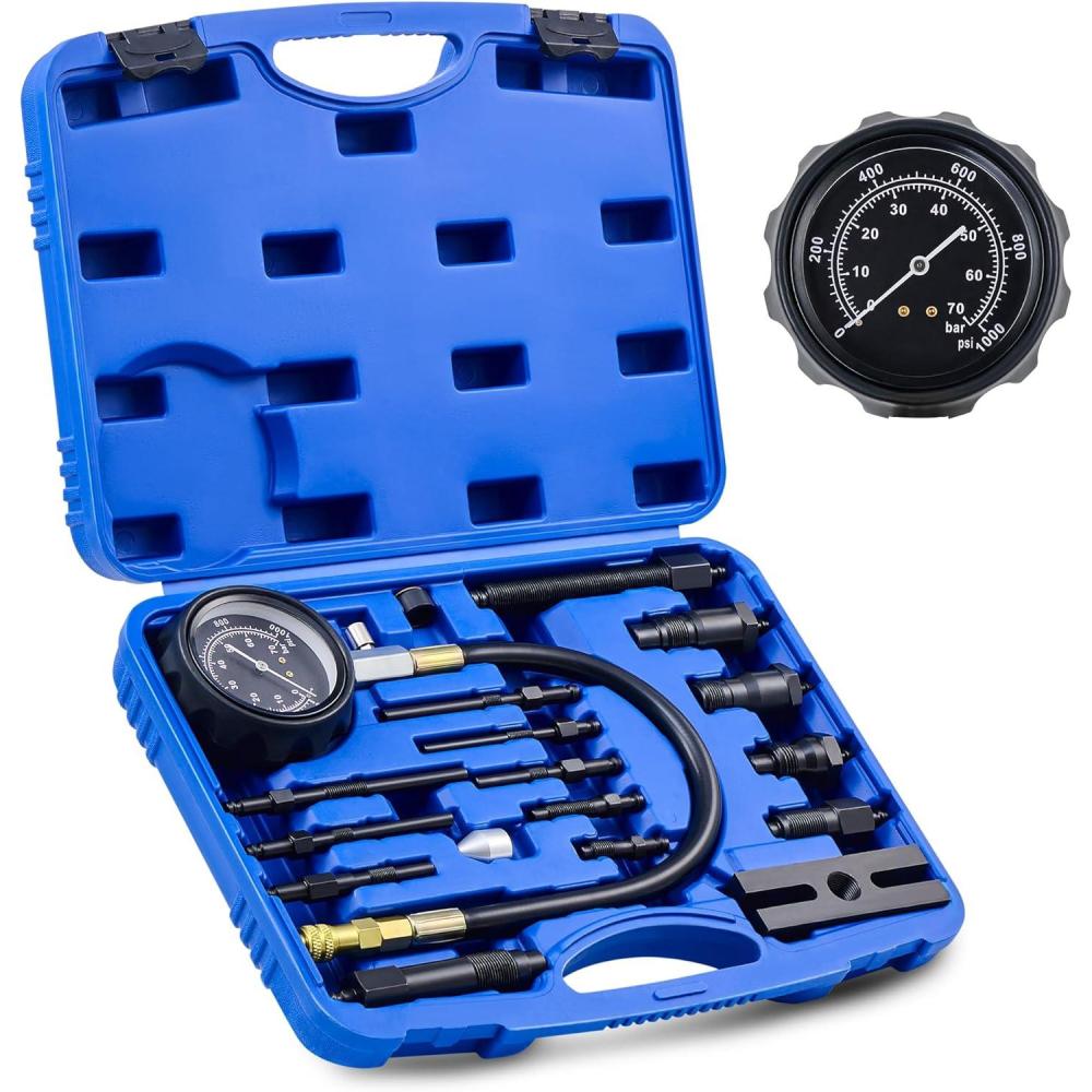 Orion Motor Tech Diesel Engine Compression Tester, 18pc Diesel Compression Tester with 0-1000 psi Diesel Pressure Gauge Adapters, Diesel Injector Tester Diesel Pressure Tester Kit