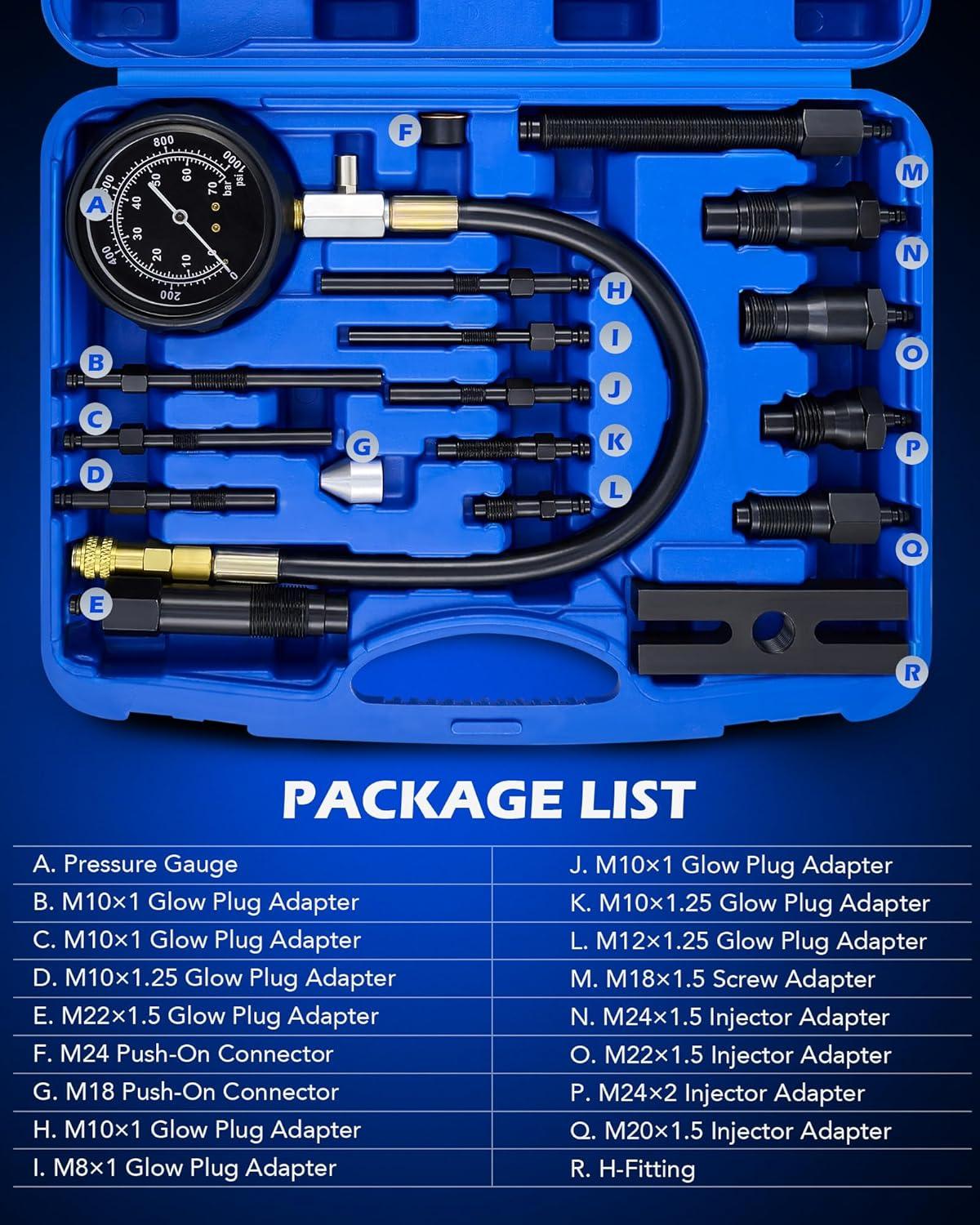 COMPLETE TEST KIT: This diesel compression tester kit by Orion Motor Tech comes with a highly accurate diesel pressure gauge as well as all the necessary adapters and fittings to let you independently assess the condition of your engine's cylinders