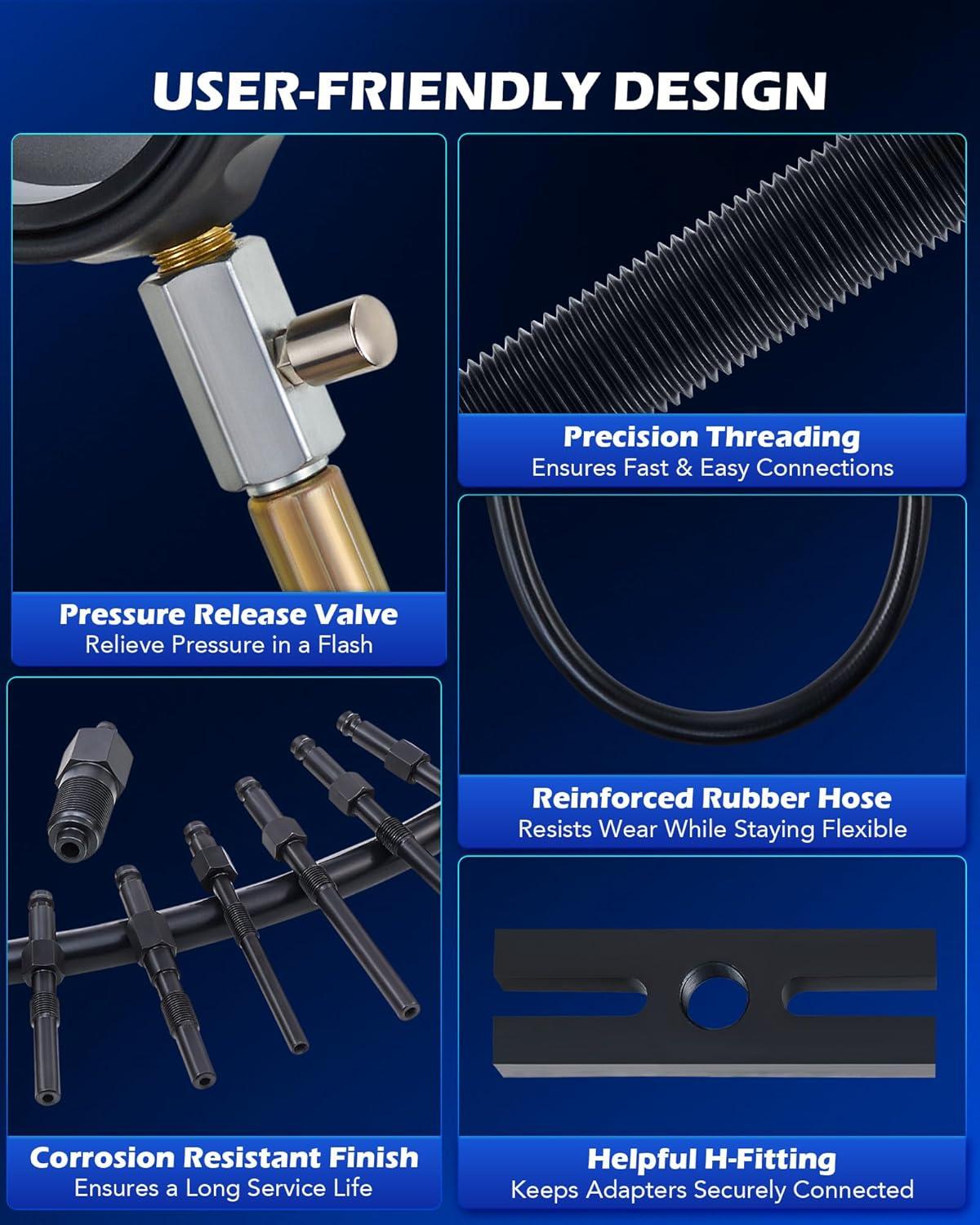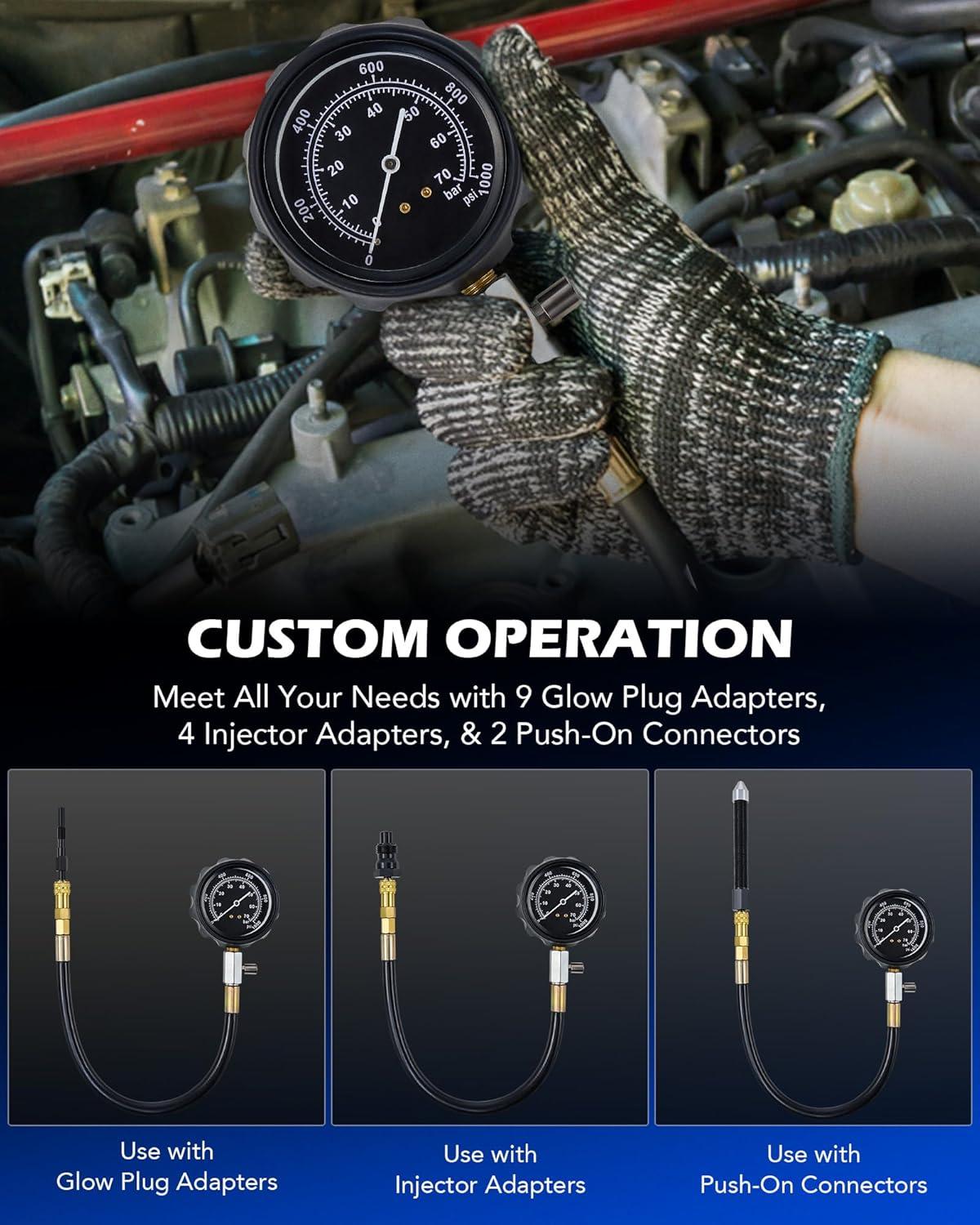 VERSATILE USE: Our diesel compression tester works with diesel engines on a wide range of vehicles including cars, trucks, ATVs, motorcycles, and more, thanks to the included glow plug adapters, injector adapters, and push-on connectors