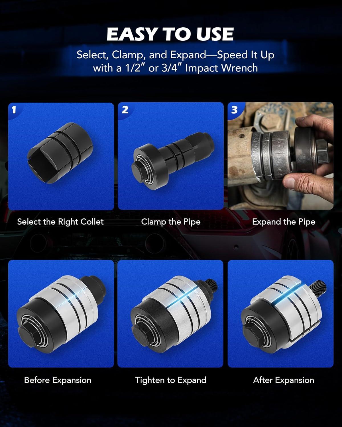 Effortless Operation: Before you start with the exhaust expander tool, just lubricate all the parts. Select the right collet, clamp the pipe, and expand it—it's that easy! For even faster results, use a 1/2″ or 3/4″ impact wrench to make your job easier