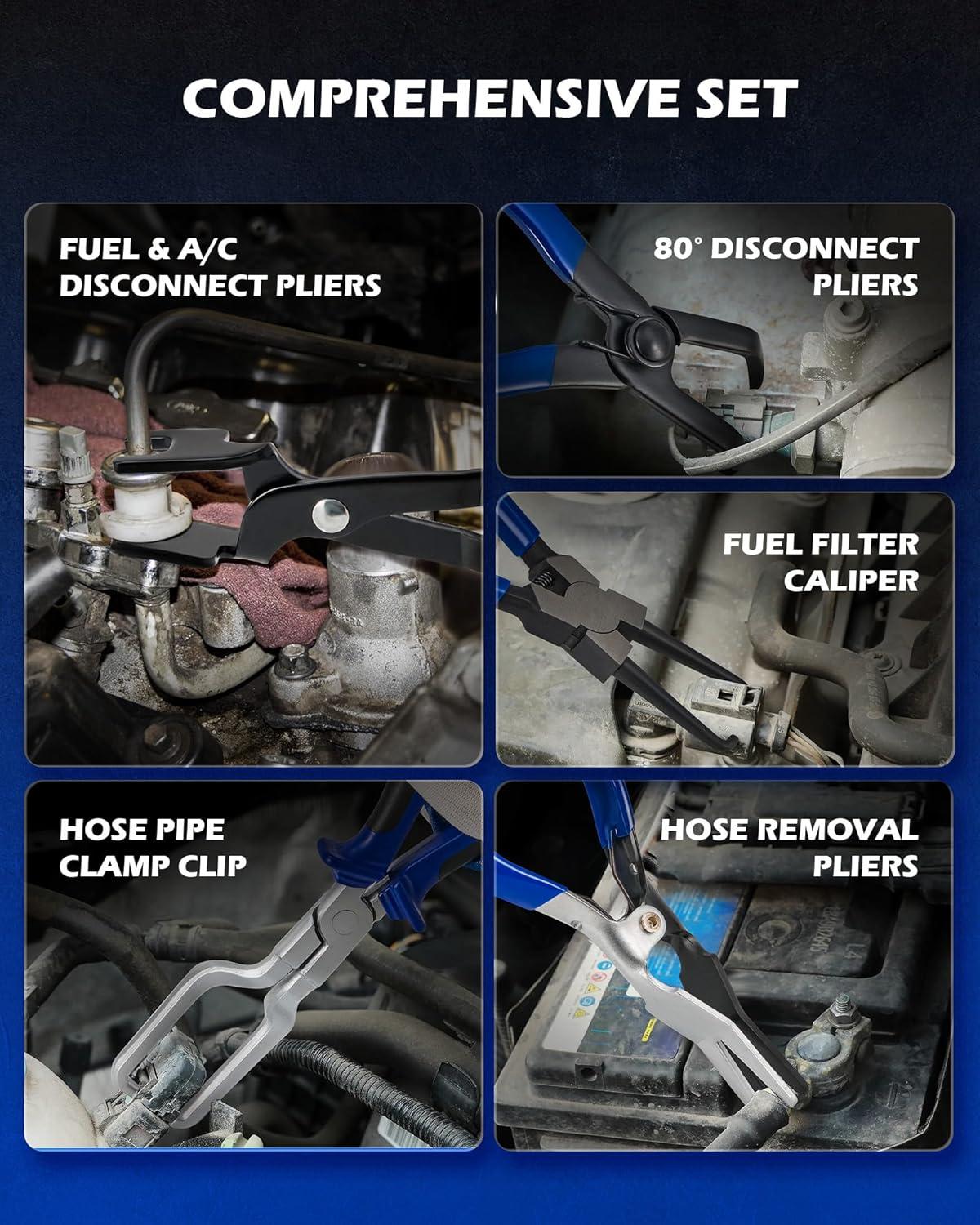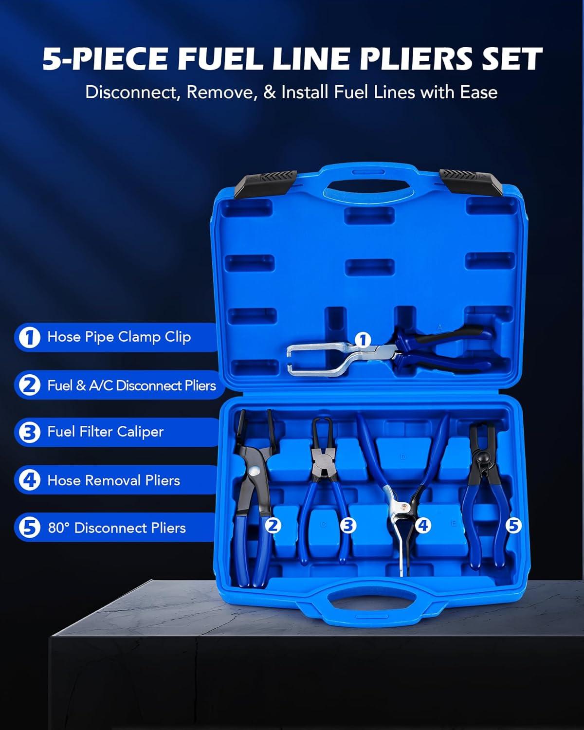 Comprehensive Line Repair Kit: Orion Motor Tech offers a 5 pcs fuel line pliers set for auto fuel line & AC repairs, including fuel & A/C disconnect pliers, hose removal pliers, hose pipe clamp clip, fuel filter caliper, and 80 degree disconnect pliers
