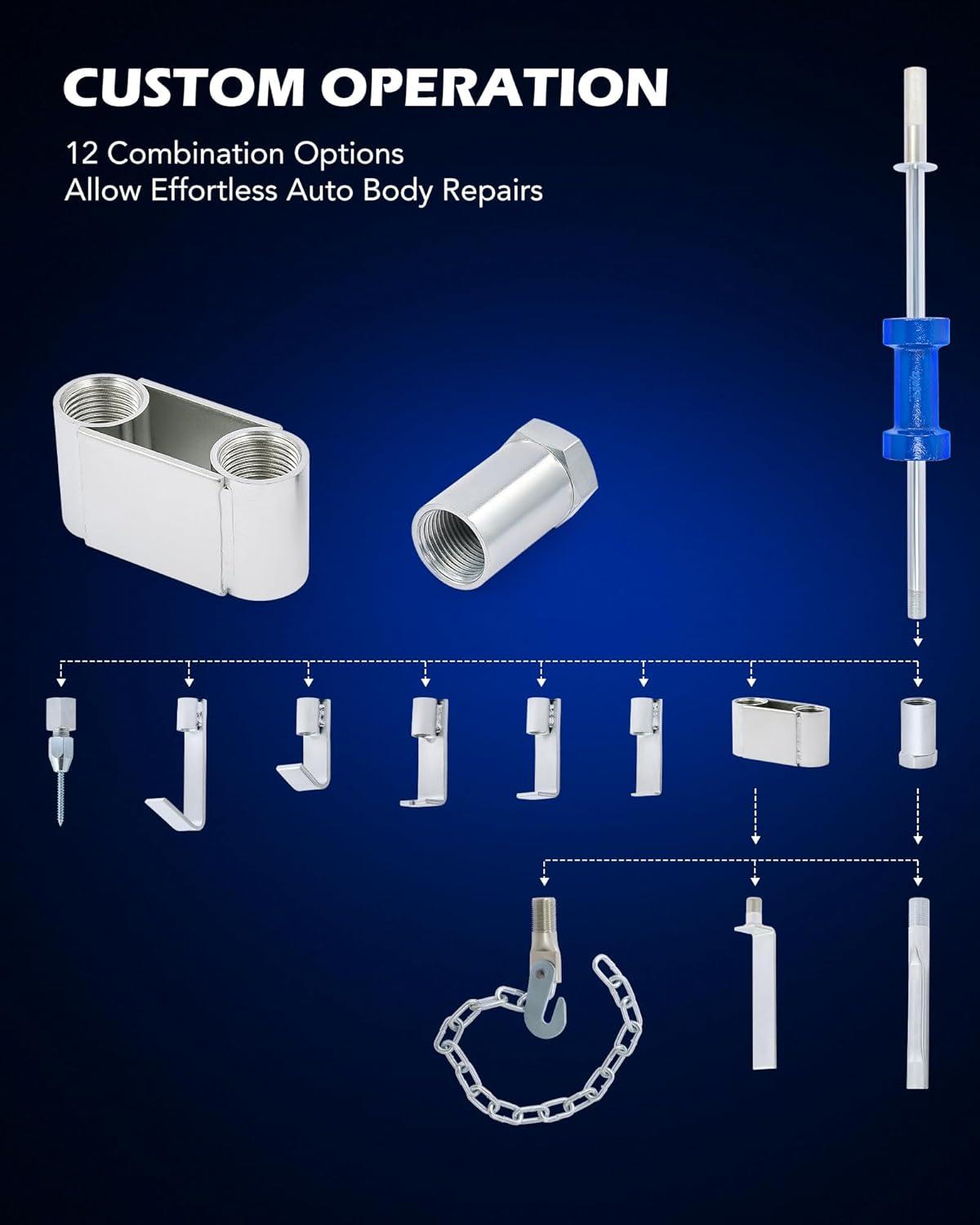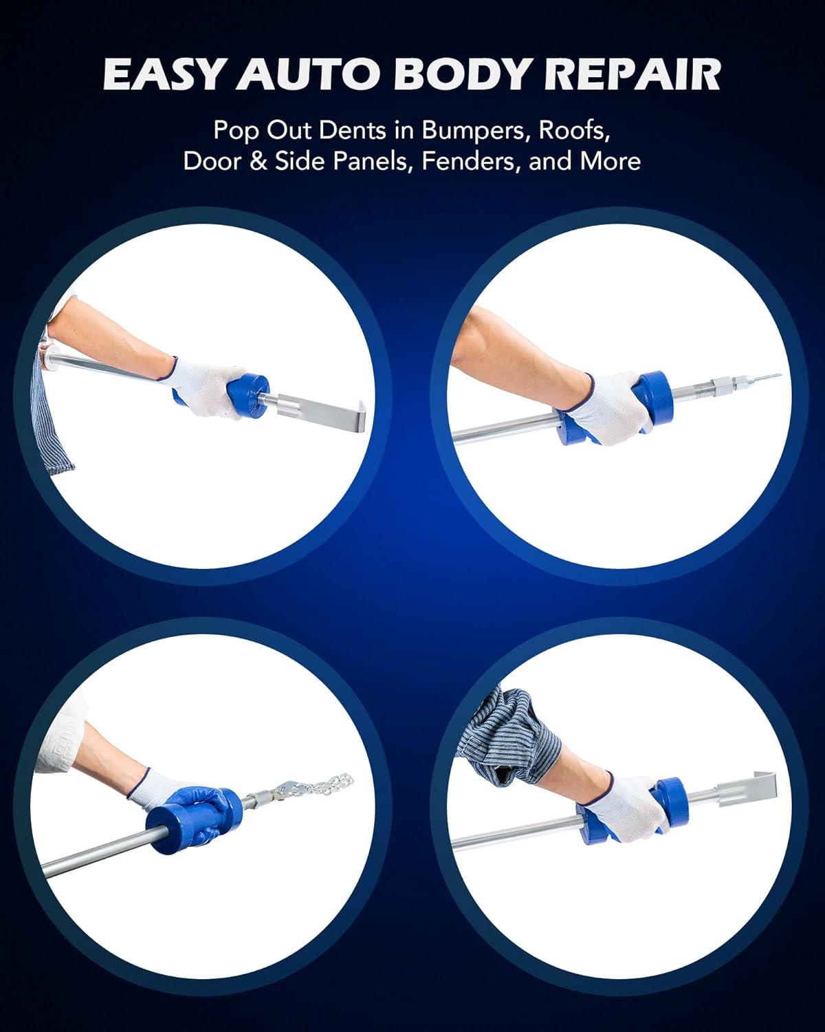 AUTO BODY REPAIR: Orion Motor Tech’s slide hammer dent puller set quickly and easily pulls out creases and bumps without removing the vehicle’s inside panel and upholstery, perfect for handling most dings and dents to your cars, trucks, and more