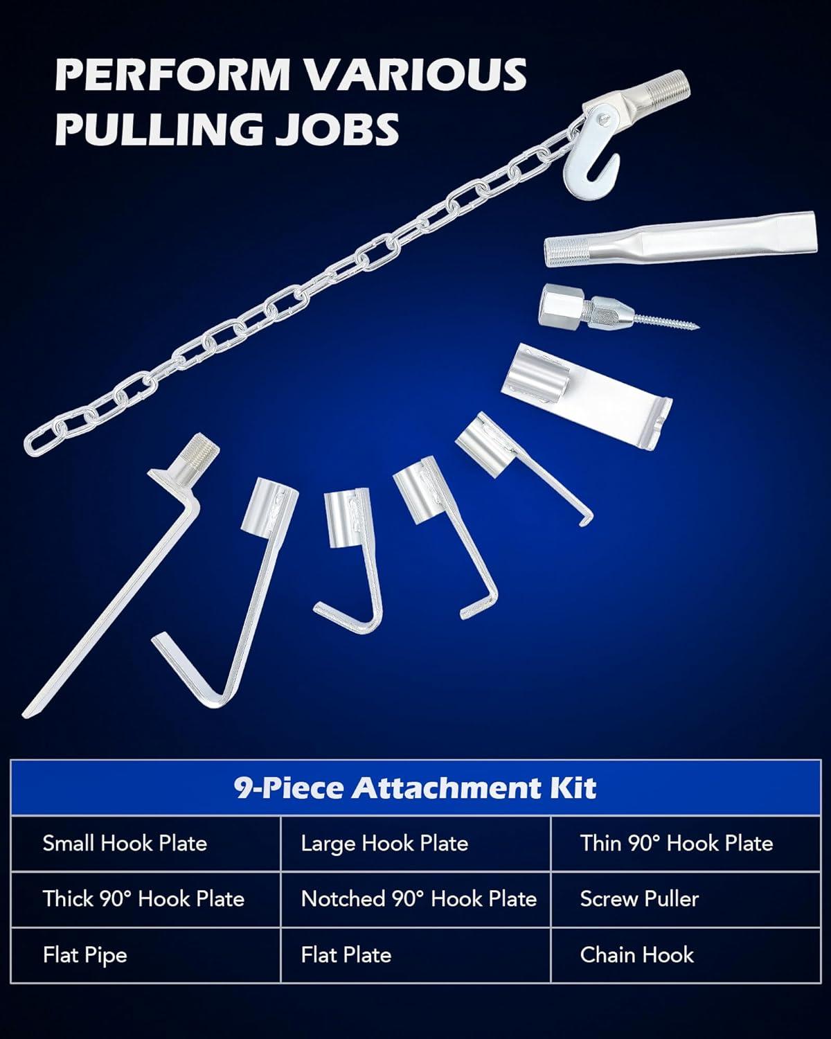 VERSATILE ACCESSORIES: This 14 piece car dent removal kit comes with a variety of attachments, including a chain hook, 2 pry bars, 5 different flat hooks, and a screw puller to match your needs for pulling dents on panels, bumpers, fenders, and roofs