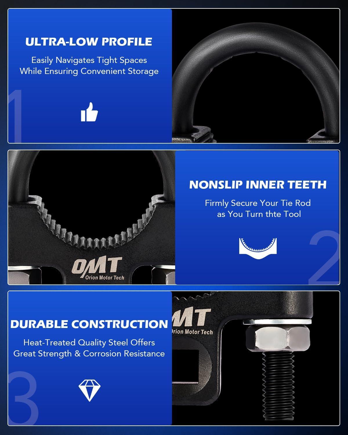 Inner Tie Rod Tool: The Orion Motor Tech 3/8″ square drive inner tie rod removal tool easily replaces inner tie rods without removing the outer one, providing practical service for tie rod removal and installation. It fits standard tie rods with smooth cylinder ends.