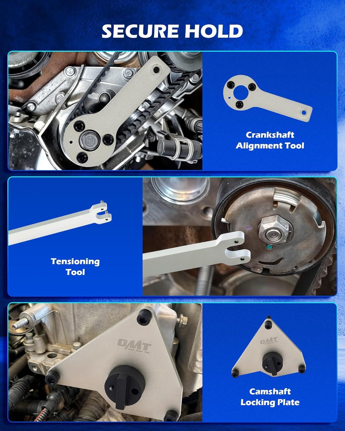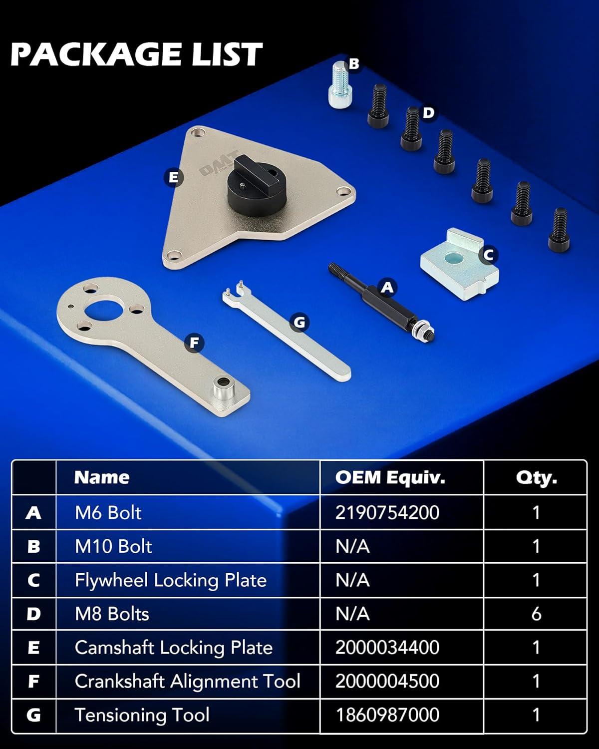 Complete Set: This OEM equivalent engine timing belt tool set comes fully equipped with a crankshaft alignment tool, camshaft locking plate, flywheel locking plate, tensioning tool, and matching bolts for engine timing service