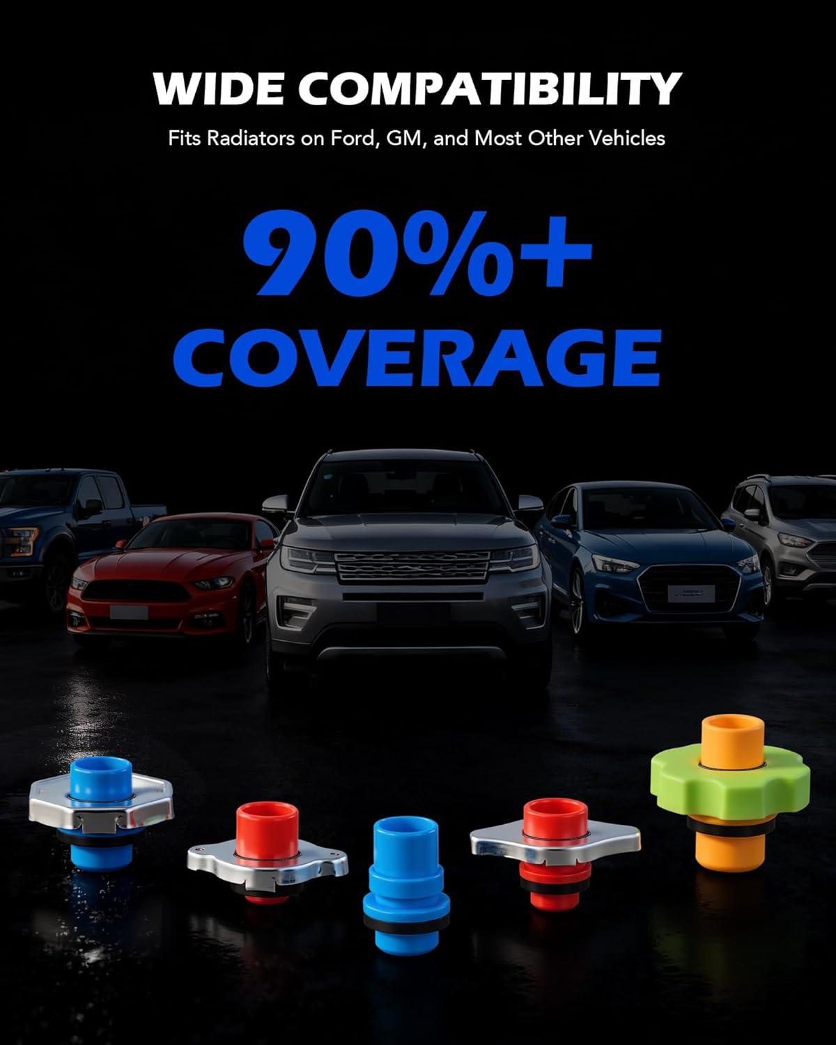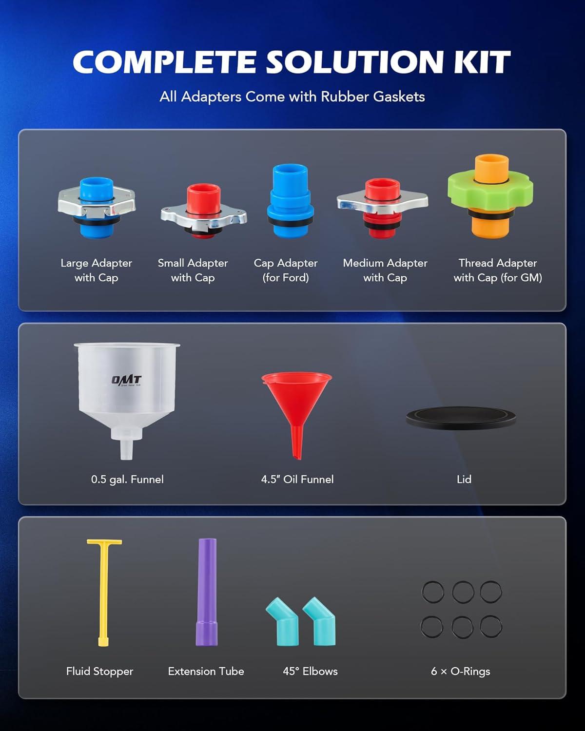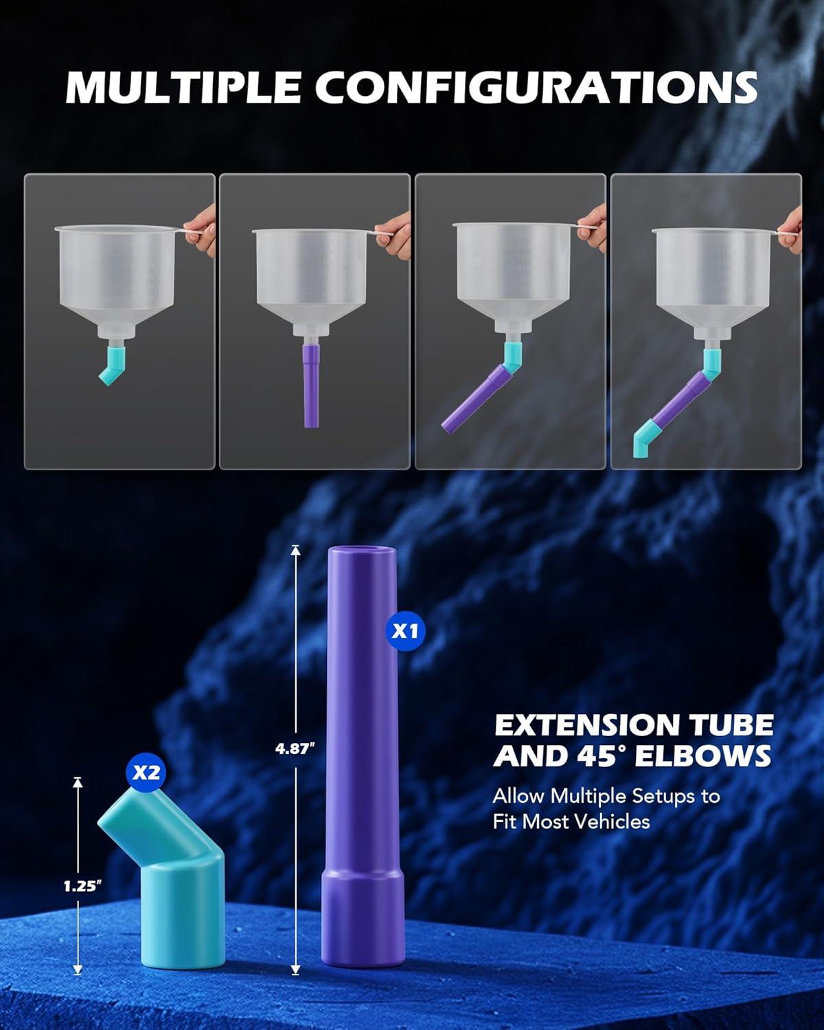 Fits Most Vehicles: This radiator funnel burping kit includes a 0.5 gal main funnel, a 4.5″ oil funnel, five adapters, four caps, two 45° elbows, a 5″ extension tube, and six O-rings to let you service radiators on GM, Ford, and most other vehicles