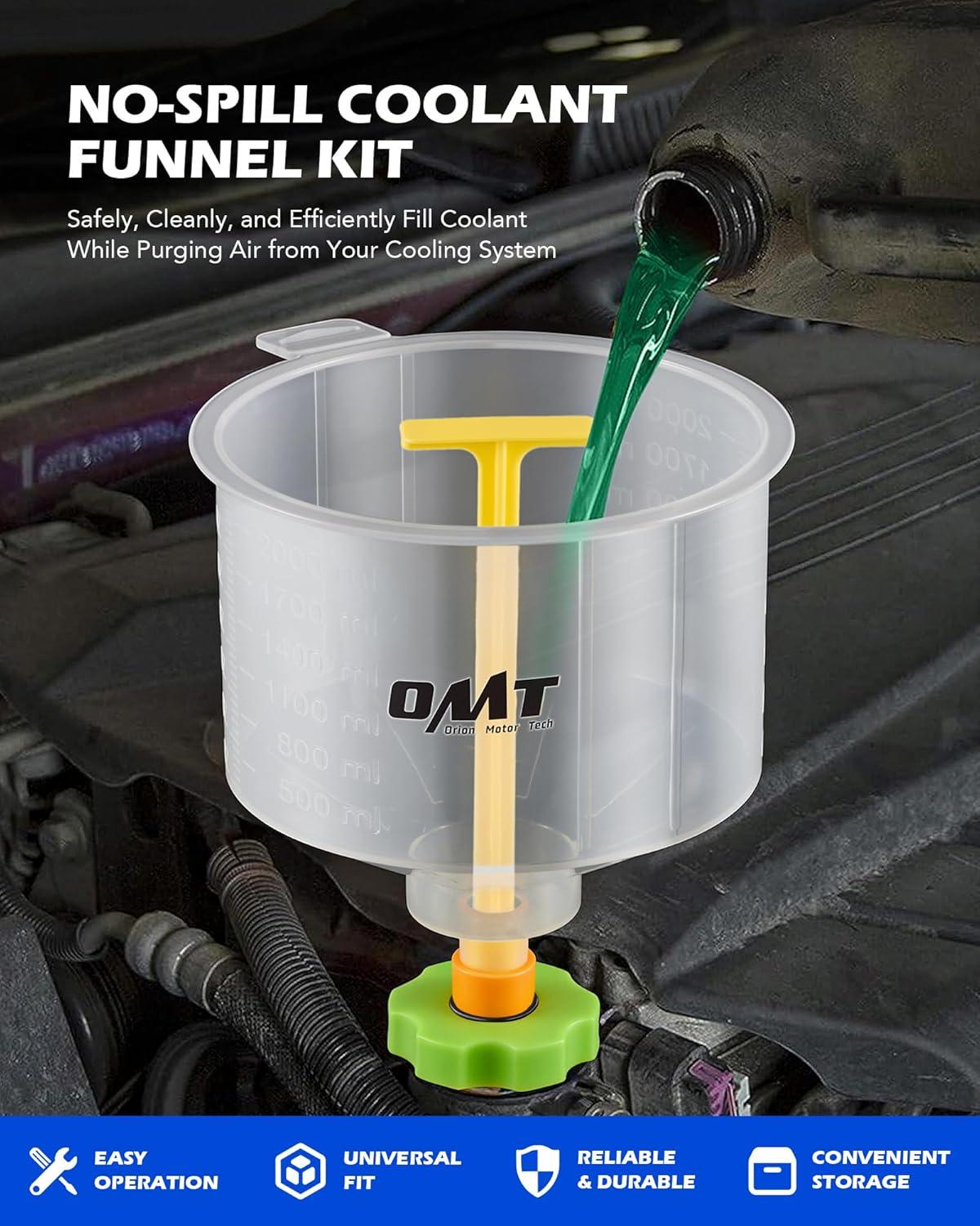 Leakproof Filling: Add fluids to your vehicle without the mess. Orion Motor Tech’s no-spill coolant funnel kit features an insert-and-lock fluid stopper to prevent leaks, keeping your cooling system clean and fully functional during filling or testing