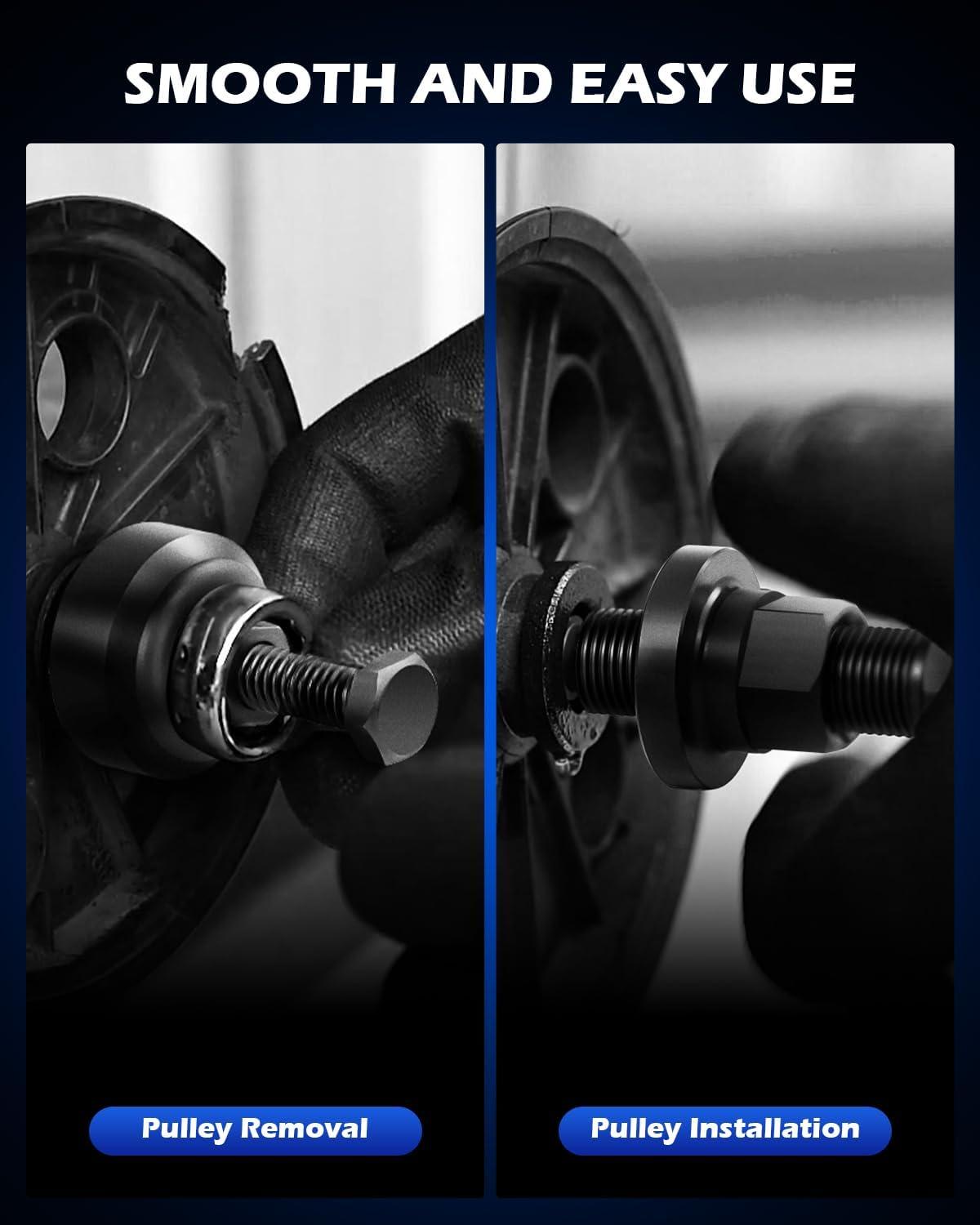 COMPLETE 7-PIECE SET: This pulley pump puller kit includes a pulley remover, a pulley installer, 2 forcing screws, 1 sleeve, 2 puller jaws, and a disconnect tool; the reversible puller jaw design also lets you check and repair pulley flanges with greater ease