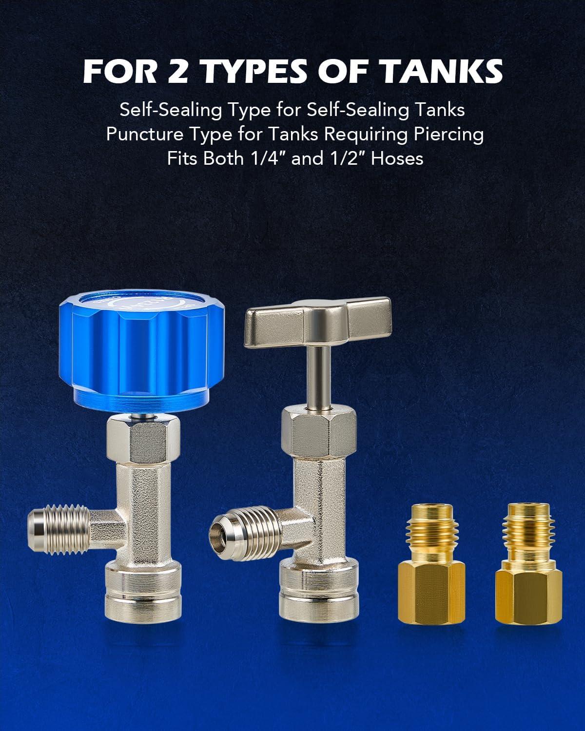 Valve Core Remover & Tank Adapter: Simplify valve core replacement tasks with the dual-ended tool, providing two sizes for versatile use. Easily connect to a 1/2″ charging hose using the included 1/4″ female to 1/2″ male R1234yf can tap adapter