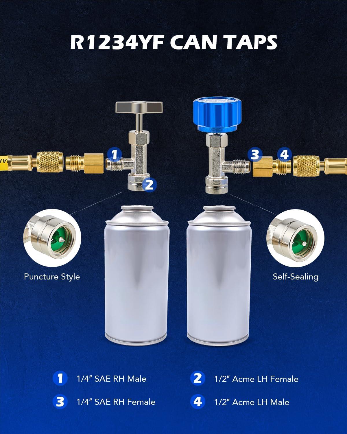 R1234yf Can Taps Included: Our R1234yf self-sealing & puncture can taps are expertly crafted for use with R1234yf refrigerant cans with left-hand threading. Please note that they are not compatible with R134A refrigerant cans with right-hand threading