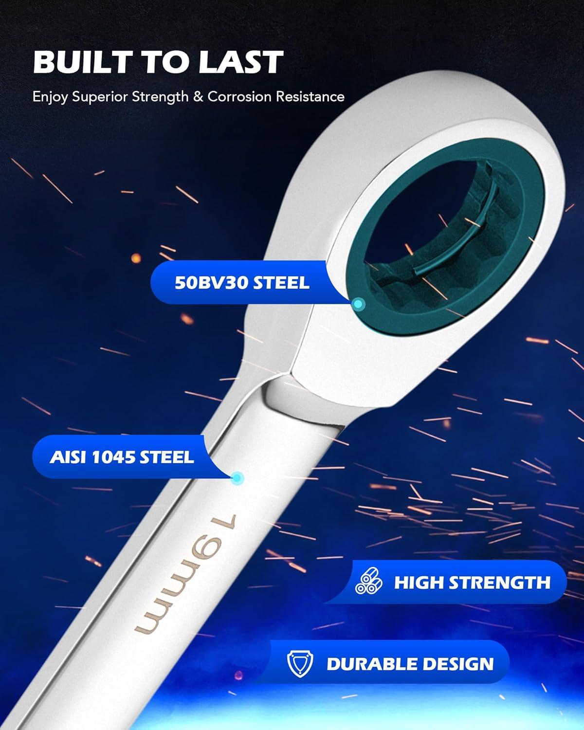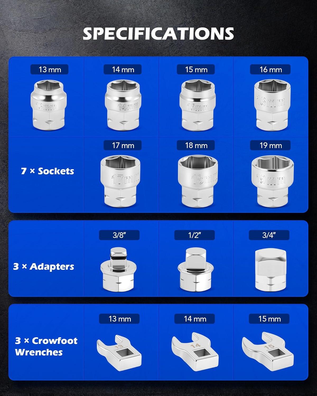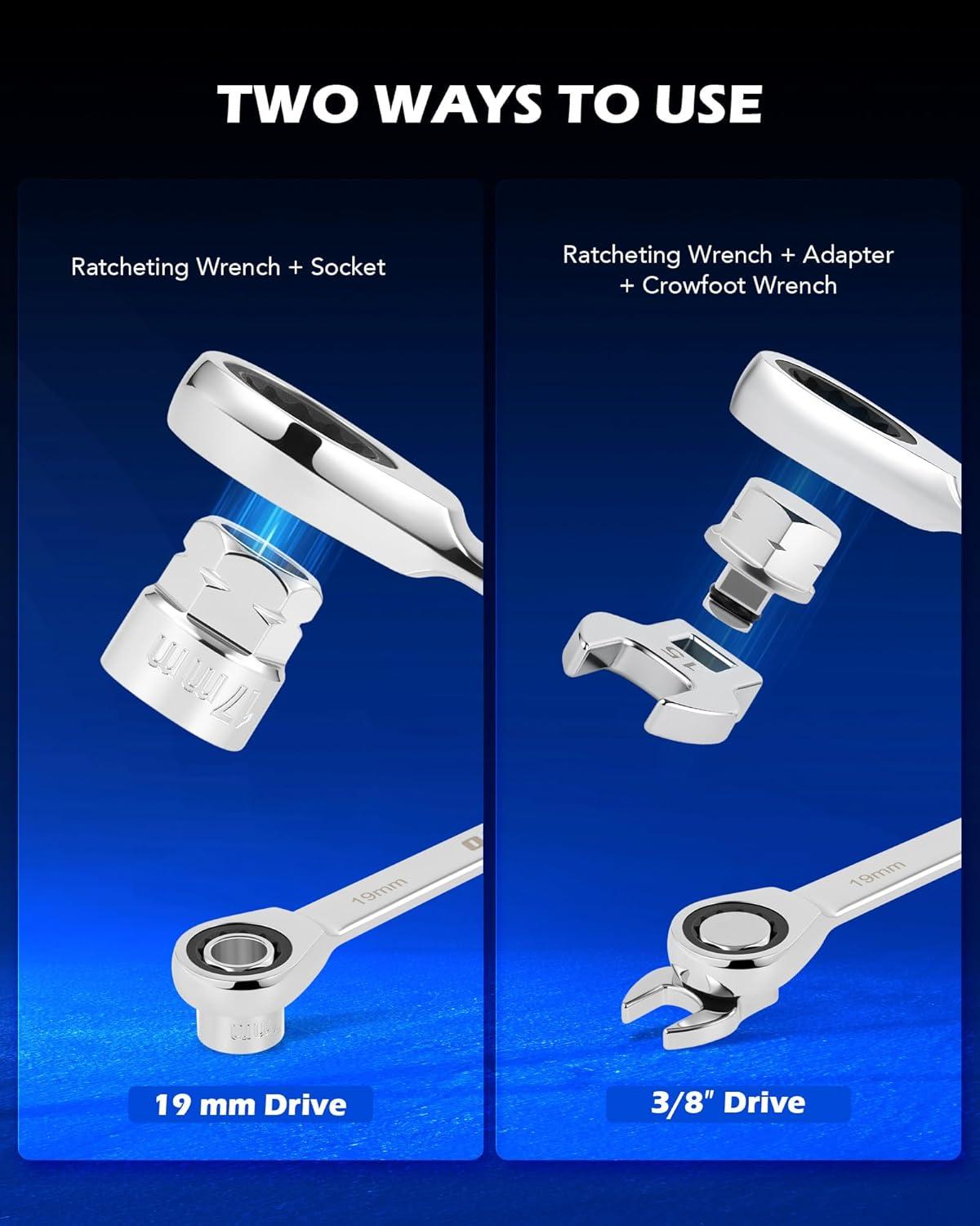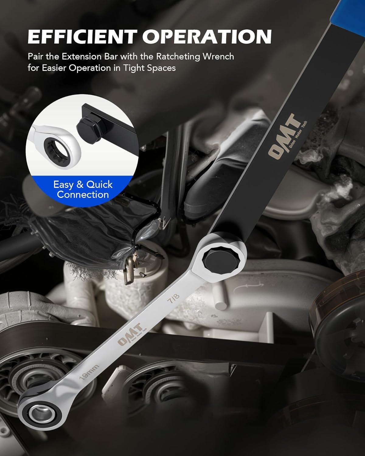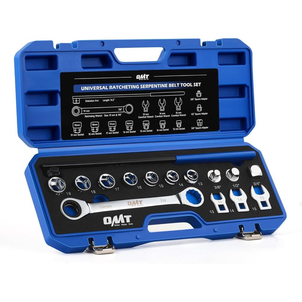 Comprehensive Kit: This serpentine belt tool kit has everything you need, including a 19 mm & 7/8″ ratcheting wrench, seven 6-point sockets (13-19 mm), three crowfoot wrenches (13-15 mm), three adapters (3/8″, 1/2″, 3/4″), and a 14.17″ extension bar