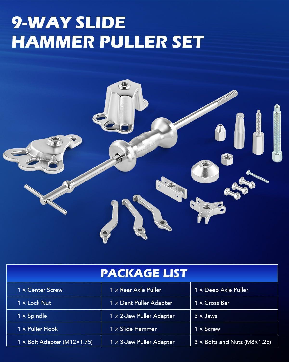 Comprehensive Tool Set: This 9-way slide hammer puller set from Orion Motor Tech features a 4 lb. hammer, making easy work of pulling flange-type rear axles, front-wheel-drive hubs, dents, and more!