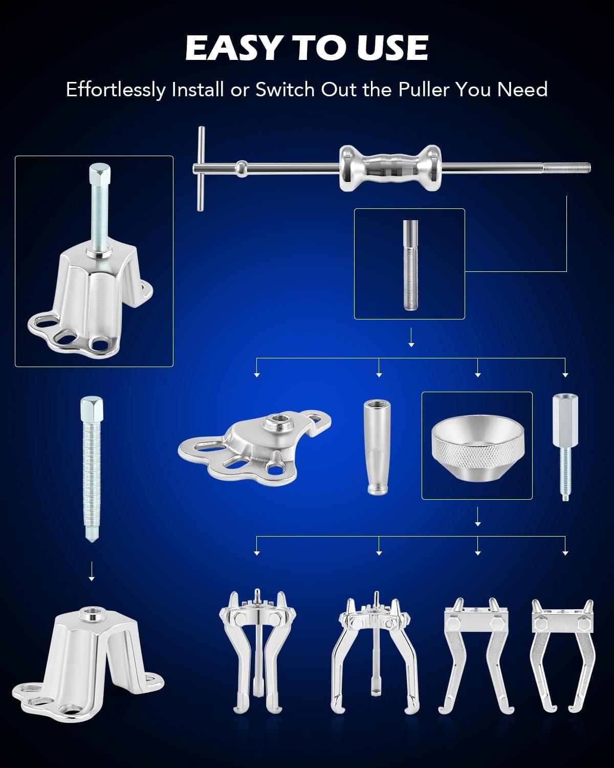 Universal Compatibility: With 2-jaw and 3-jaw puller adapters, our slide hammer puller kit offers a variety of combinations for extracting bearings, gears, and seals, handling both internal to external tasks.