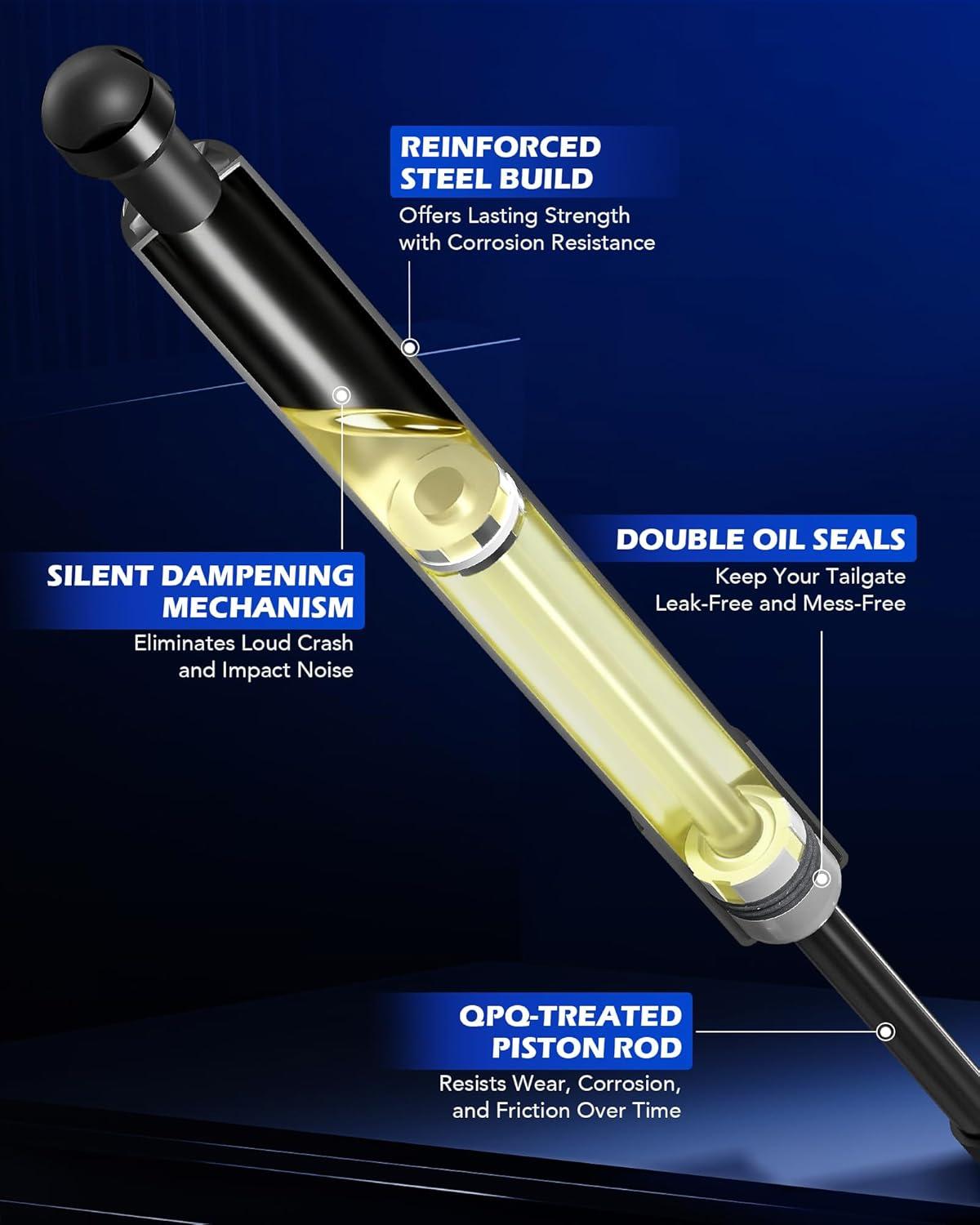 Built Tough, Rain or Shine: Our pickup tailgate shock absorbers handle heavy rain and repeated use without faltering. Made from electroplated structural-grade steel with a riveted mount, they resist bending and corrosion for smooth, reliable operation