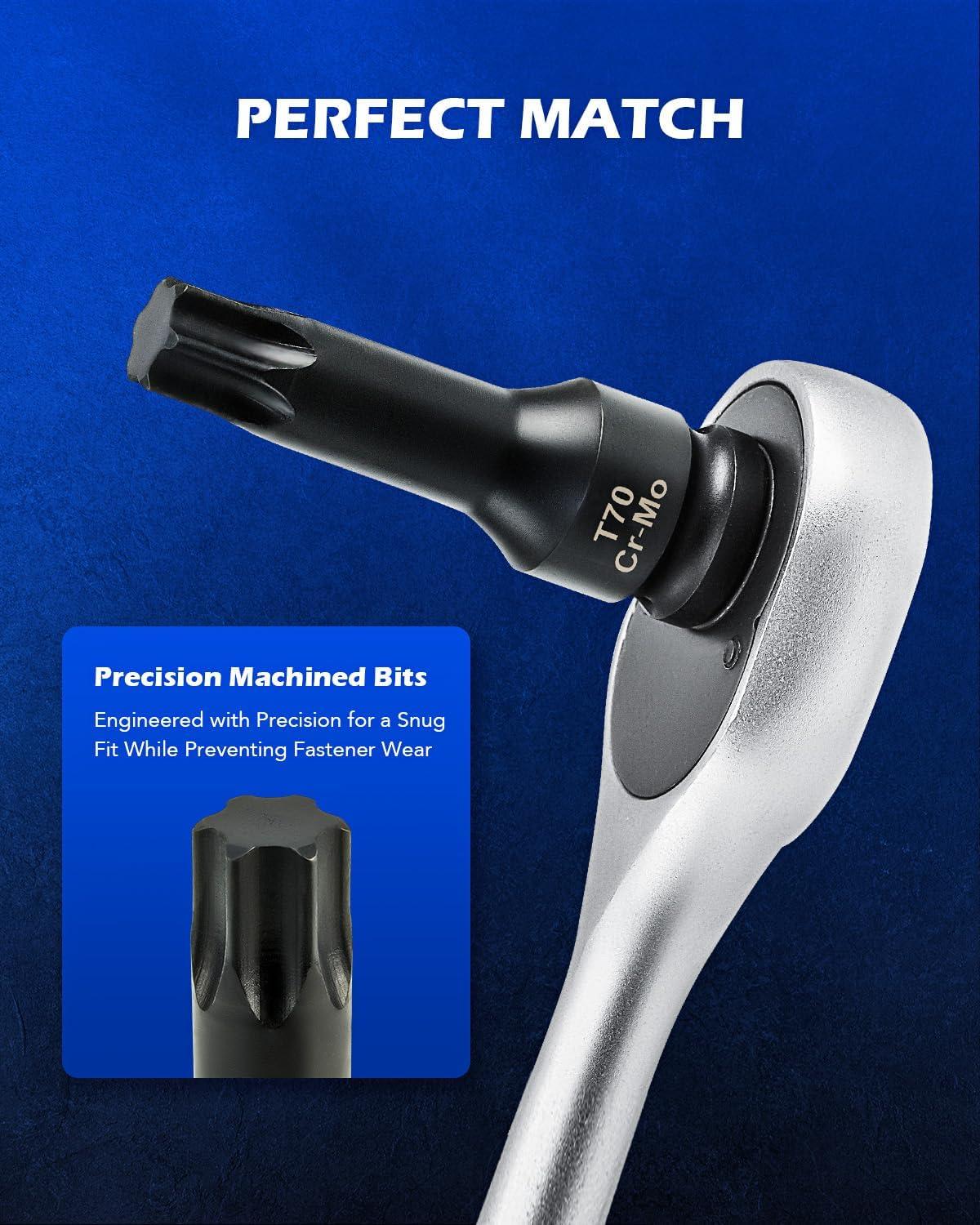 Engineered for Lasting Use: The Torx sockets are expertly crafted from robust Cr-Mo steel with a black phosphate coating for superior strength and exceptional corrosion resistance, ensuring reliable performance for years to come.