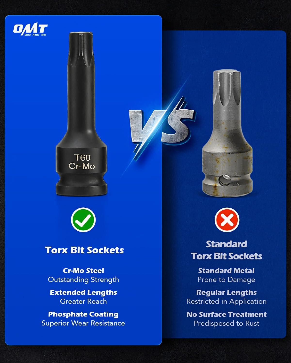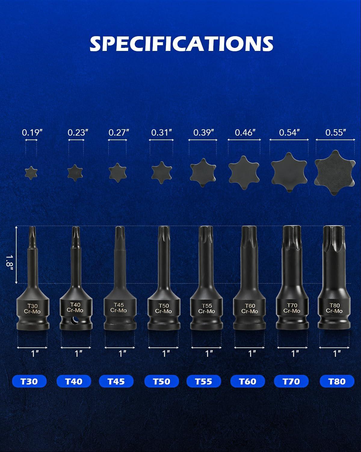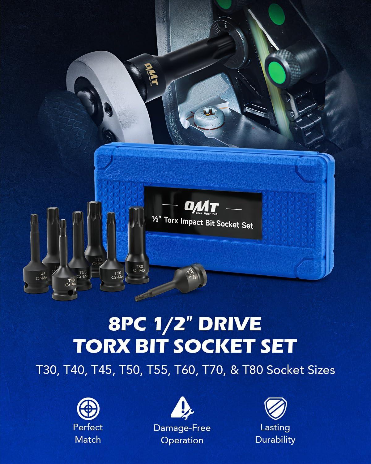 Handle Torx Fasteners with Ease: Orion Motor Tech's 1/2″ drive Torx bit socket set provides the solution for quick & easy removal and replacement of Torx fasteners. The set includes the eight most commonly used Torx sockets: T30, T40, T45, T50, T55, T60, T70, and T80.