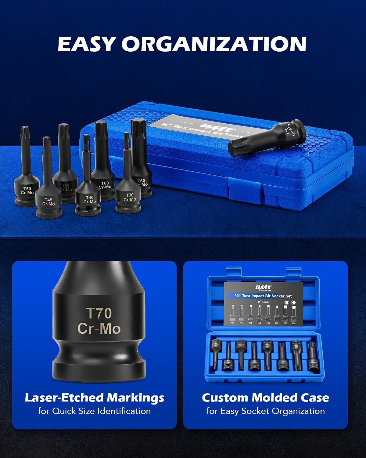 Hassle-Free Organization: Easily locate the right socket with laser-etched size markings on each Torx bit socket. The provided custom blow-molded case simplifies transport and organization.